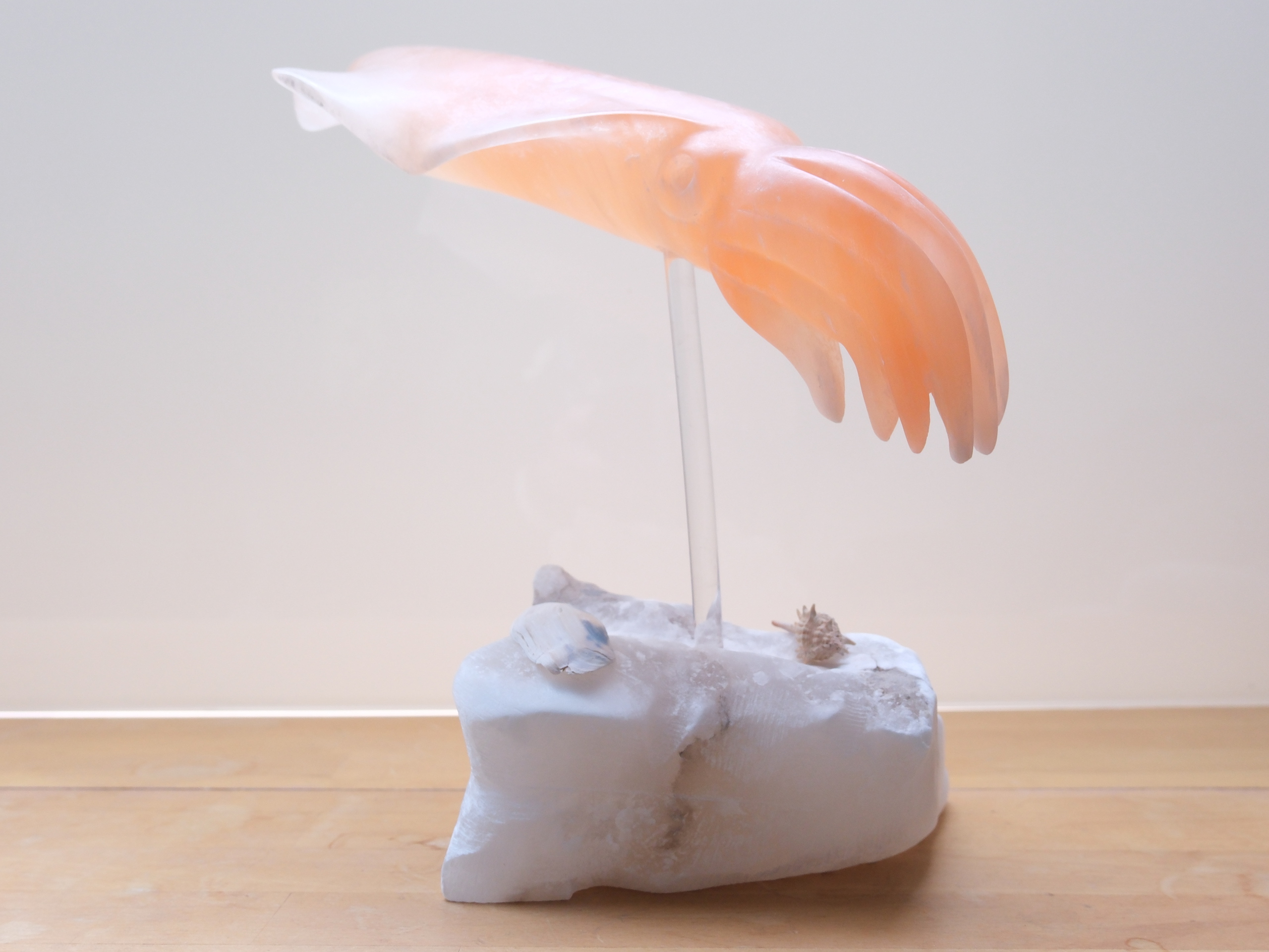 Hoe mooi kan calamaris zijn. Veel mensen hebben er geen idee van waar calamaris van is gemaakt en hoe het dier er uit ziet. Er zijn vele soorten te vinden in alle kleuren. Ook in het licht oranje is de pijlstaartinktvis een prachtig dier. Op het strand vinden we de rugschalen.. Het kristalachtige Seleniet geeft de juiste kleurschakering en transparantie ..