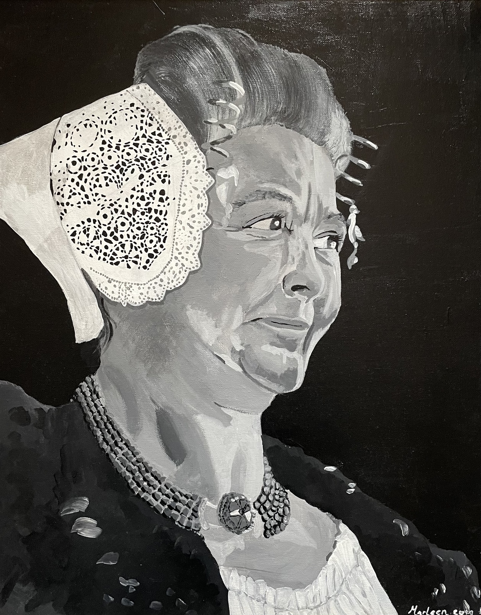 Dit werk gaat over verdriet aanzien van andere mensen en je machteloos voelen. Dit is vertaald in een vrouw in Zeeuwse Klederdracht.