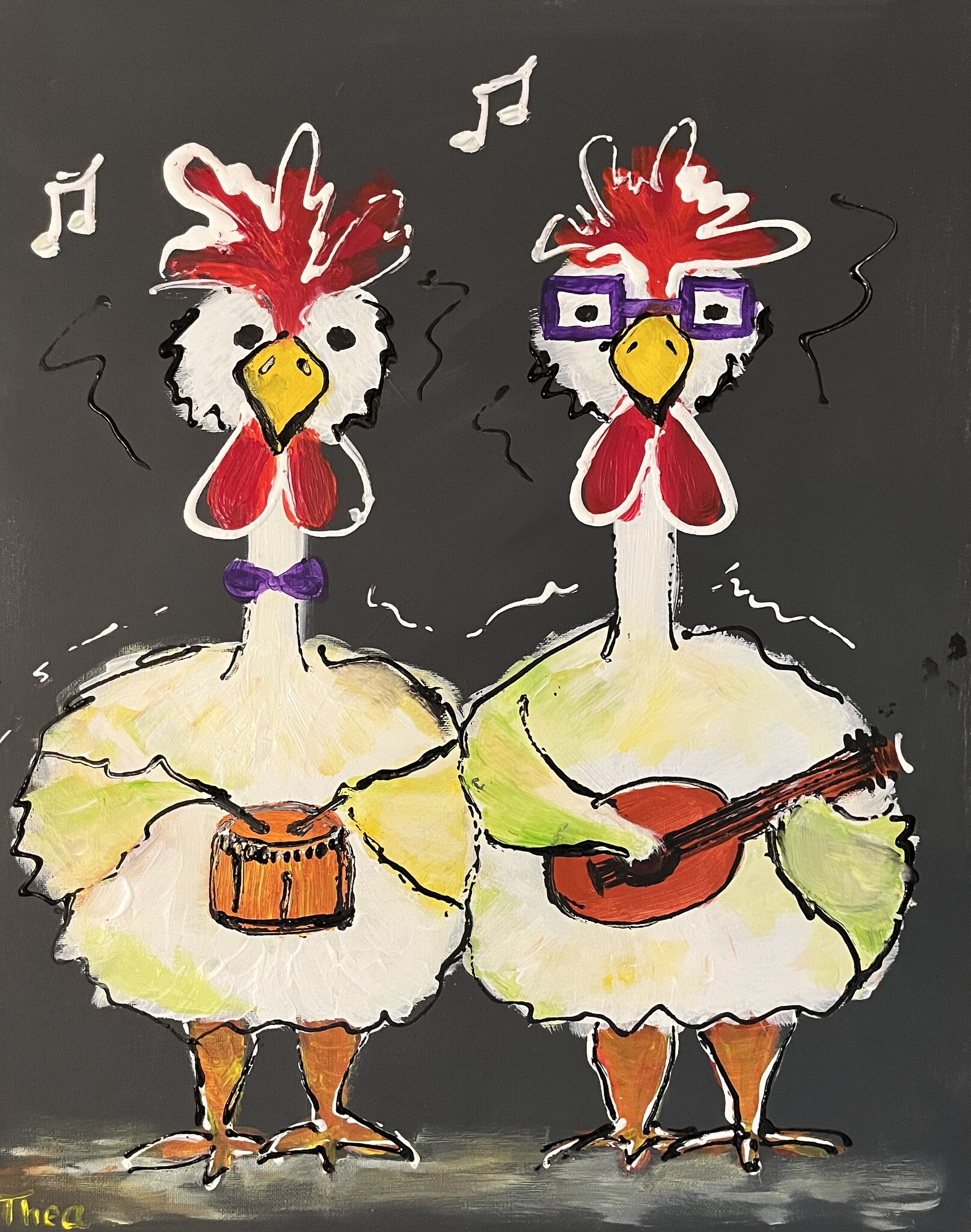 Deze koddige kippetjes zijn muzikantjes. Acryl op canvas 40x50 cm. December 2025