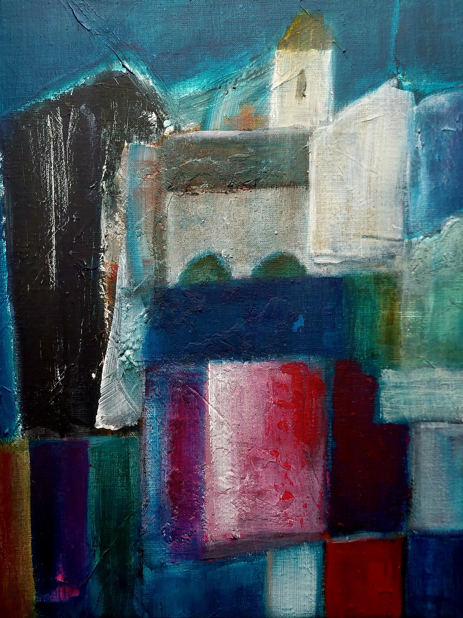 Het centrum van Dordrecht herbergt talloze mooie plekjes. Door de eeuwen heen is de stad vastgelegd door beroemde schilders uit binnen- en buitenland. Een aanzienlijk aantal van deze schilderijen is te bewonderen in het Dordrechts Museum, dat in 1842 zijn deuren opende. Dit schilderij is mijn abstracte weergave van een van die fotogenieke plekken in de stad: de Voorstraathaven, gezien in de richting van het stadhuis.