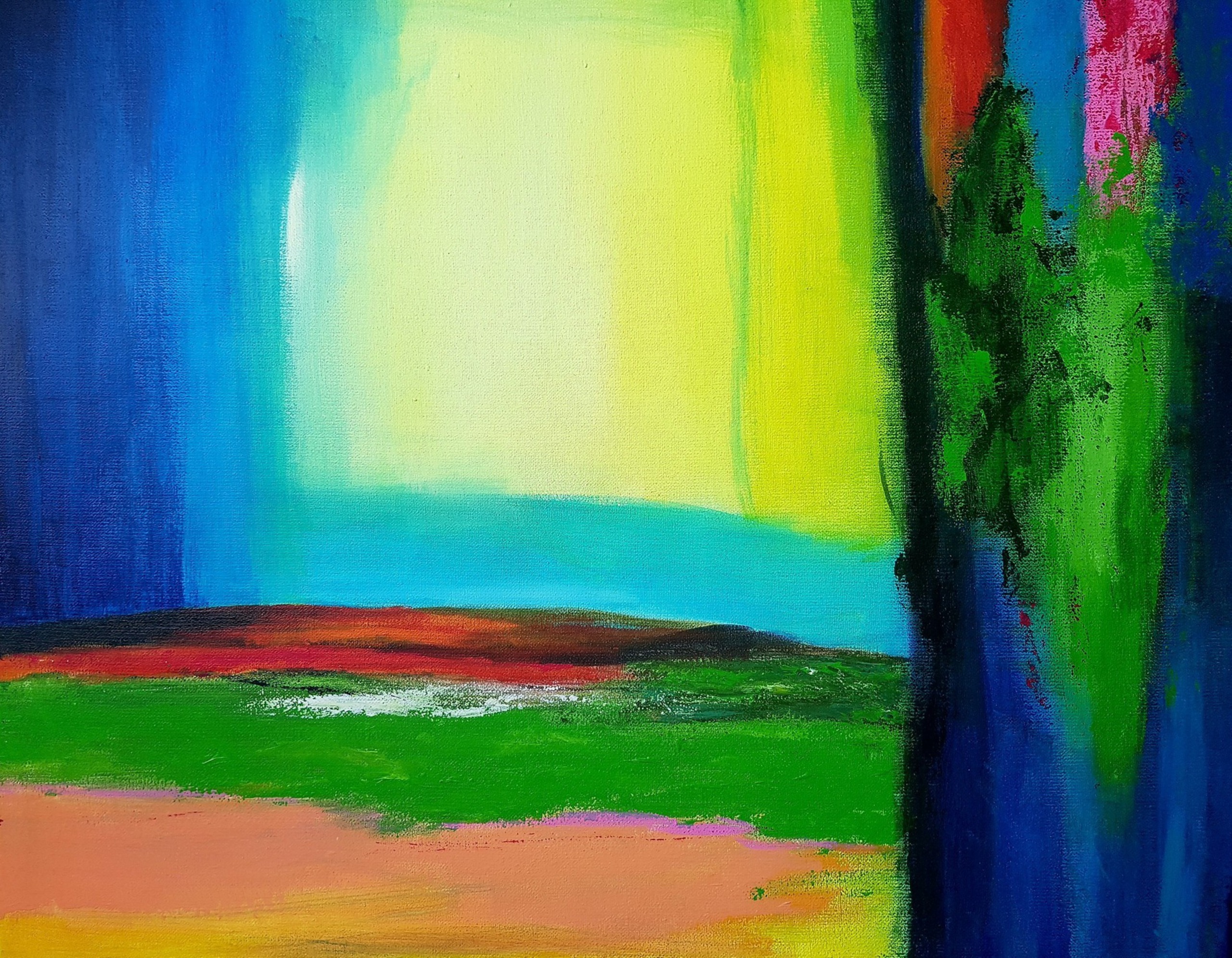 Ik heb dit schilderij gemaakt tijdens mijn verblijf in de Jura in 2018, in een week met sterk wisselende weersomstandigheden. Warme, droge dagen werden afgewisseld met kille, regenachtige dagen. Dit abstracte landschap vormt daarvan een weerspiegeling.