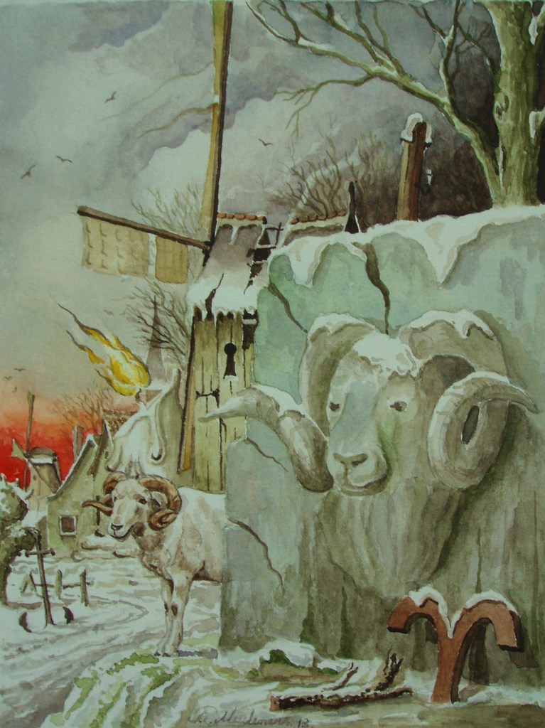 Landschap Romantiek Papier Dier Aquarel Winter Ram Realisme Fantasie Molen Kaars Sterrenbeeld Zodiac Koude