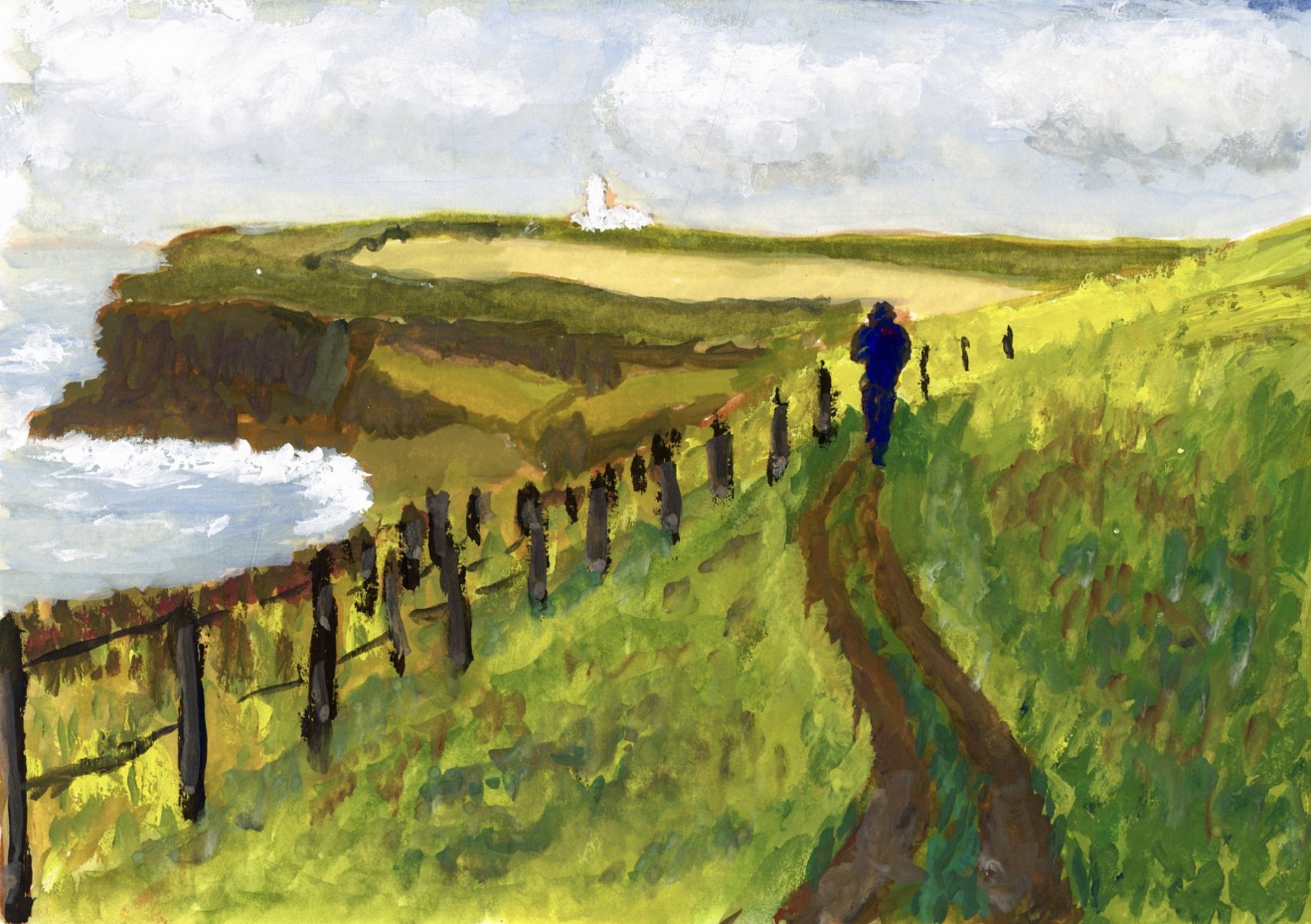 St. Bees ligt aan het begin van Wainwright’s Coast to Coast Path. Dit kleine werk in gouache, geschilderd tijdens de weken van de tocht, toont het pad, de klippen en de vuurtoren in de verte. Een wandelaar is begonnen aan zijn reis. Het landschap is teruggebracht tot grotere vlakken en open ruimte.