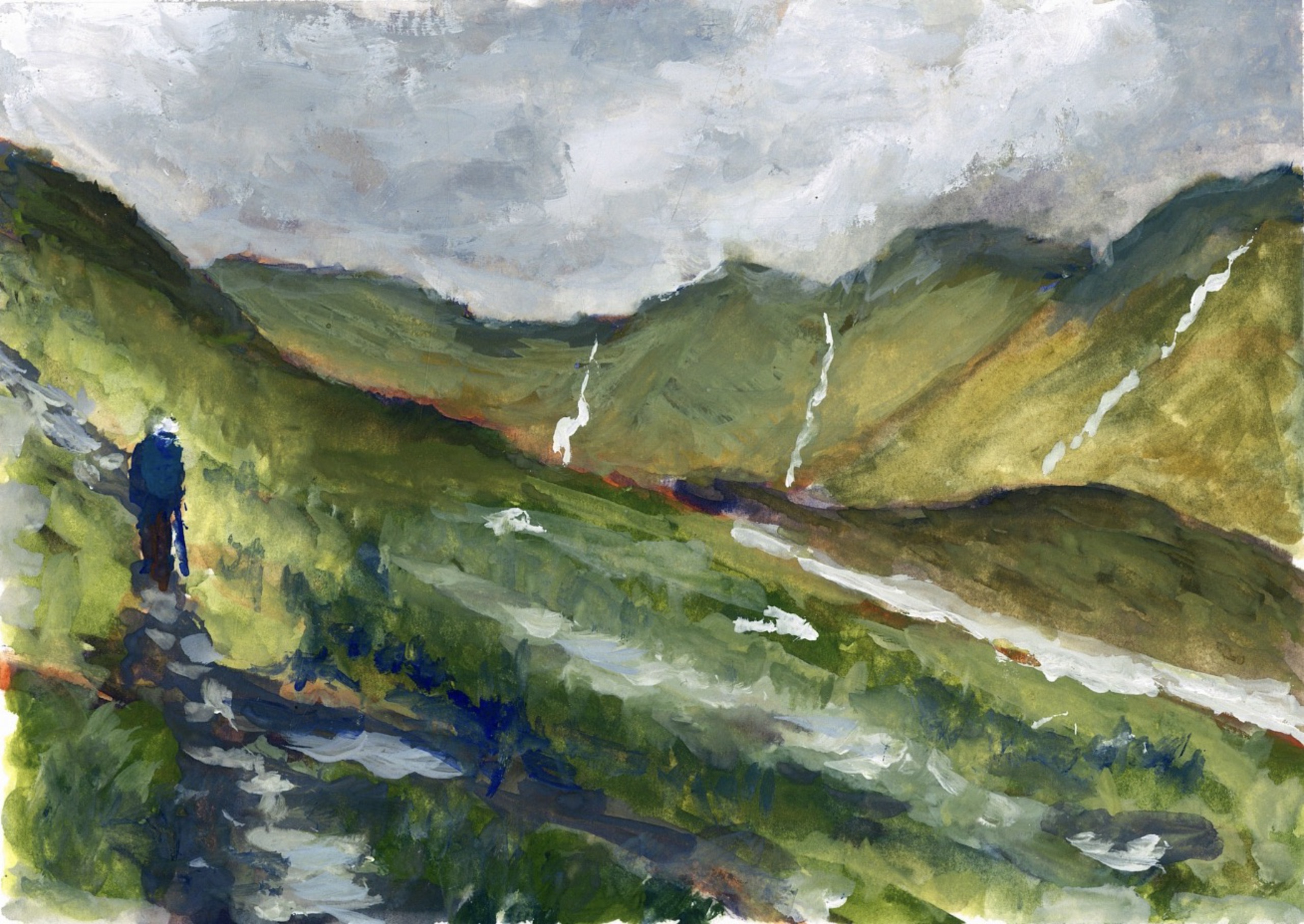 Dit kleine gouachewerk, geschilderd onderweg tijdens de Coast to Coast-tocht, toont een wandelaar op een stijgend pad in het Lake District. Het ruige, natte landschap is vereenvoudigd tot grotere vlakken geschilderd in een donker, ingetogen palet.
