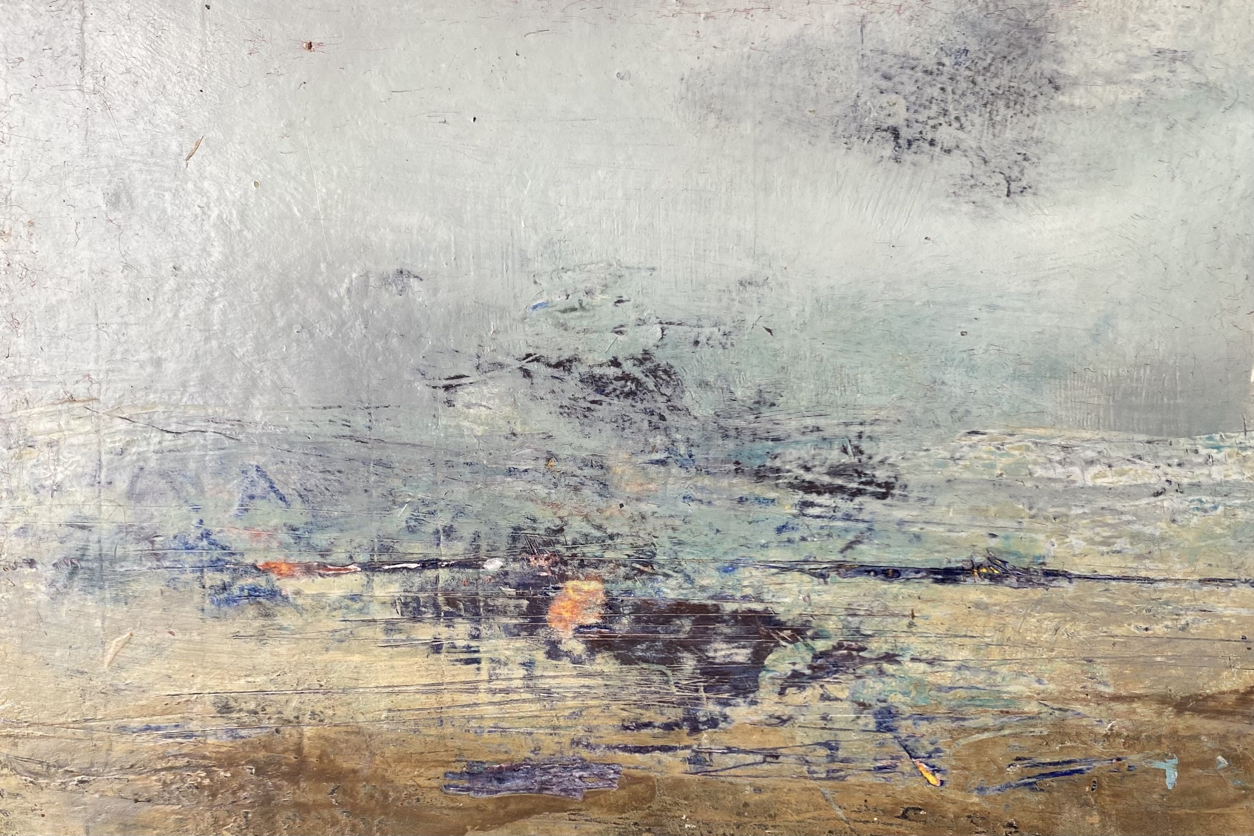 Coldwax en olieverf op papier, op 3cm dik multiplex gelijmd