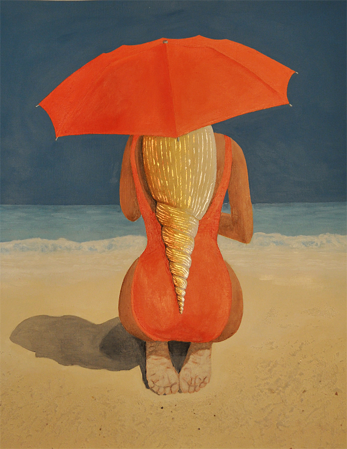 Het oranje en de omgeving neemt je gelijk mee op vakantie. Op strand is echt zand aangebracht. Het haar gaat over in een schelp; een kleine knipoog naar het surrealisme. De ondergrond is linnenpapier van Canson. Dus de inlijsting kun je zelf naar wens verzorgen. Dit werk is geschilderd op Canson Figueeras, een kwaliteits linnenpapier voor acrylverf. Het is bedekt met een speciale absorbeerlaag en zorgt voor een opmerkelijke kleurenweergave. De textuur van het papier geeft het effect van écht linnen.