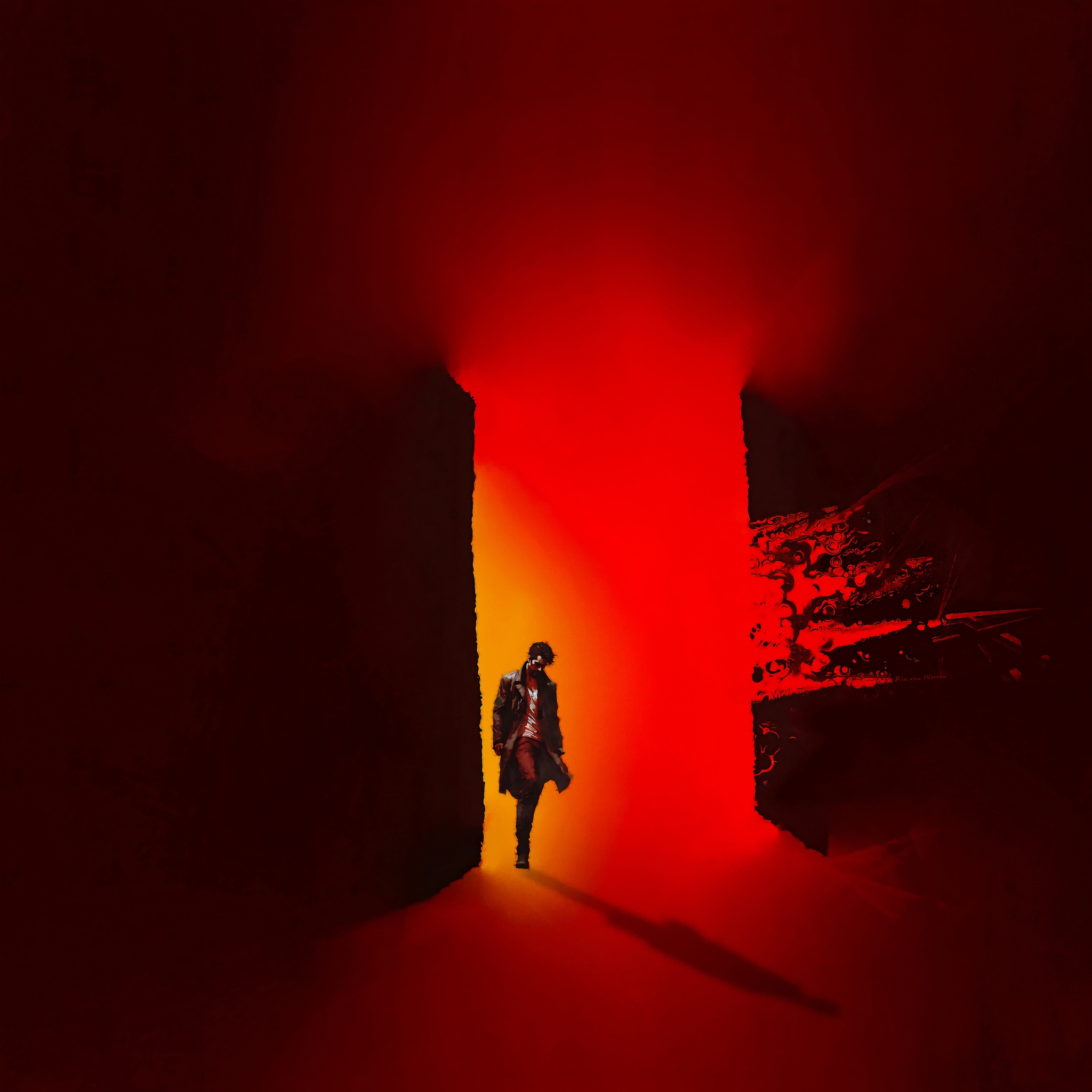 Tussen Licht En Duisternis Landschap Figuur Man Rood Geel Wit