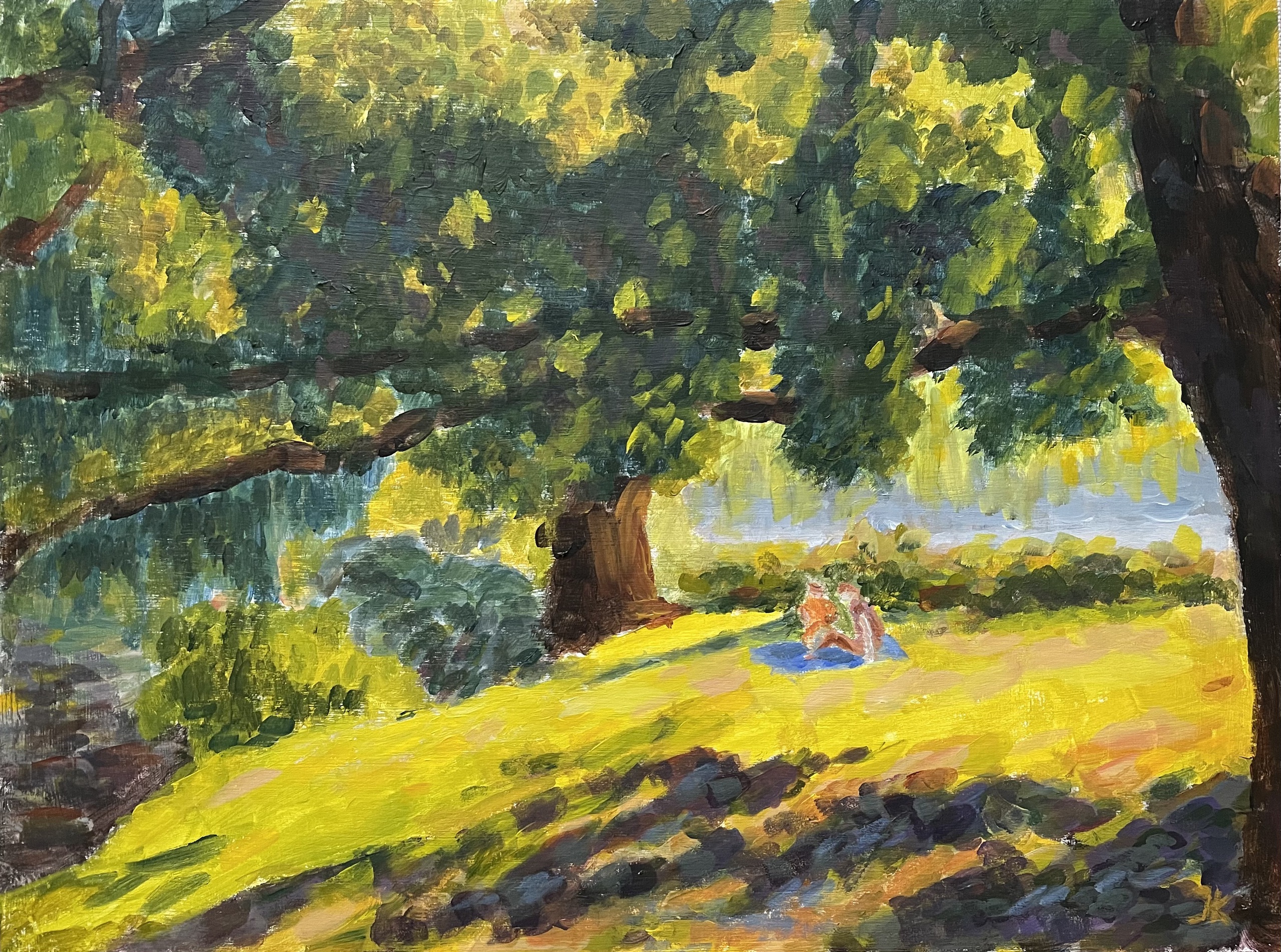 Een zonnige dag in het Leidse Plantsoen, waarin het licht gefilterd door het bladerdak over gras en aarde valt. Losse penseelstreken en heldere kleurvlakken benadrukken de werking van licht en schaduw en geven het beeld een rustige, open atmosfeer waarin het landschap centraal staat.