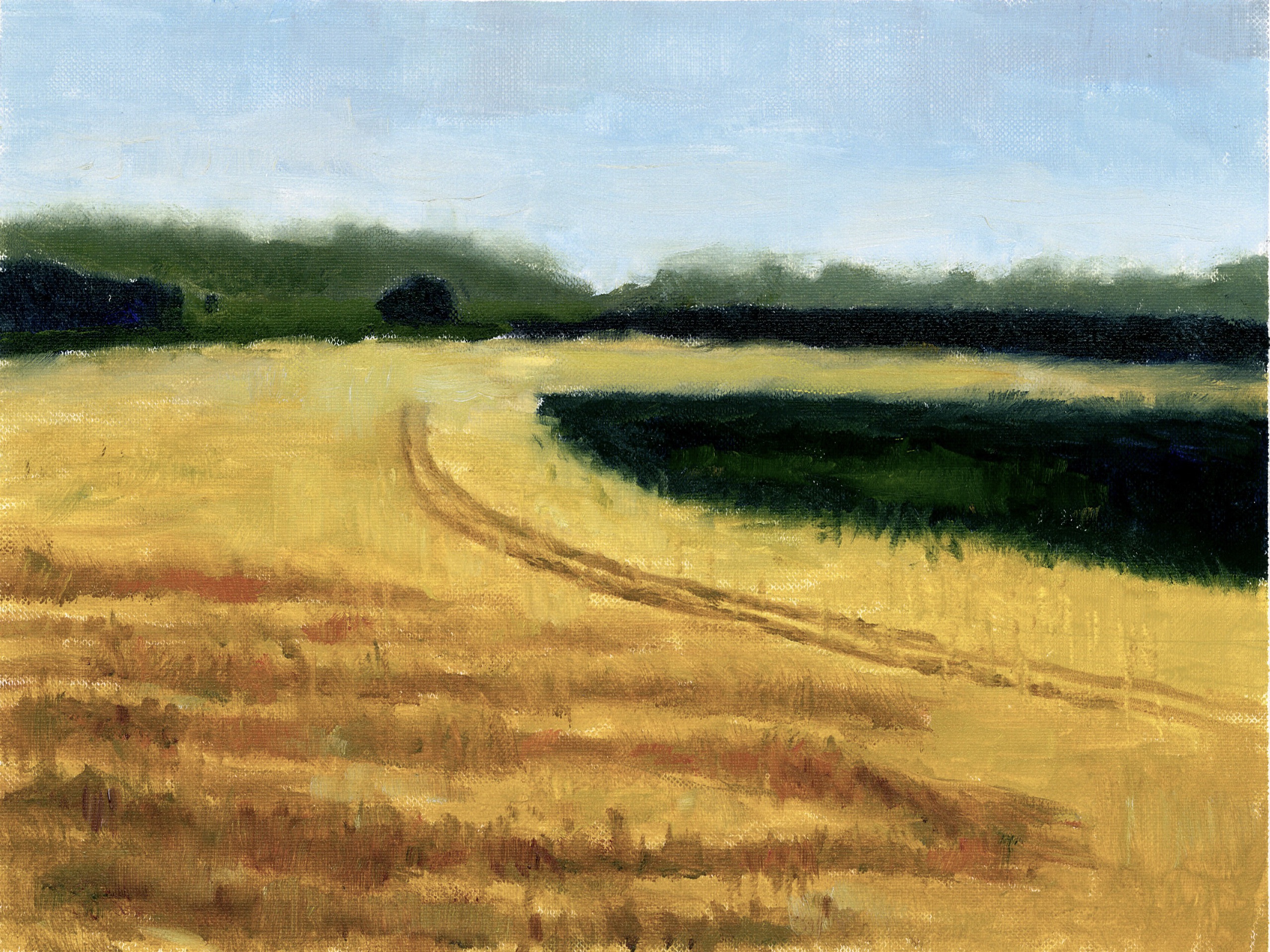 Sporen trekken door een open akker en suggereren beweging door het landschap. Vereenvoudigde vormen en zachte overgangen benadrukken afstand en stilte. Geïnspireerd door het Limburgs landschap.