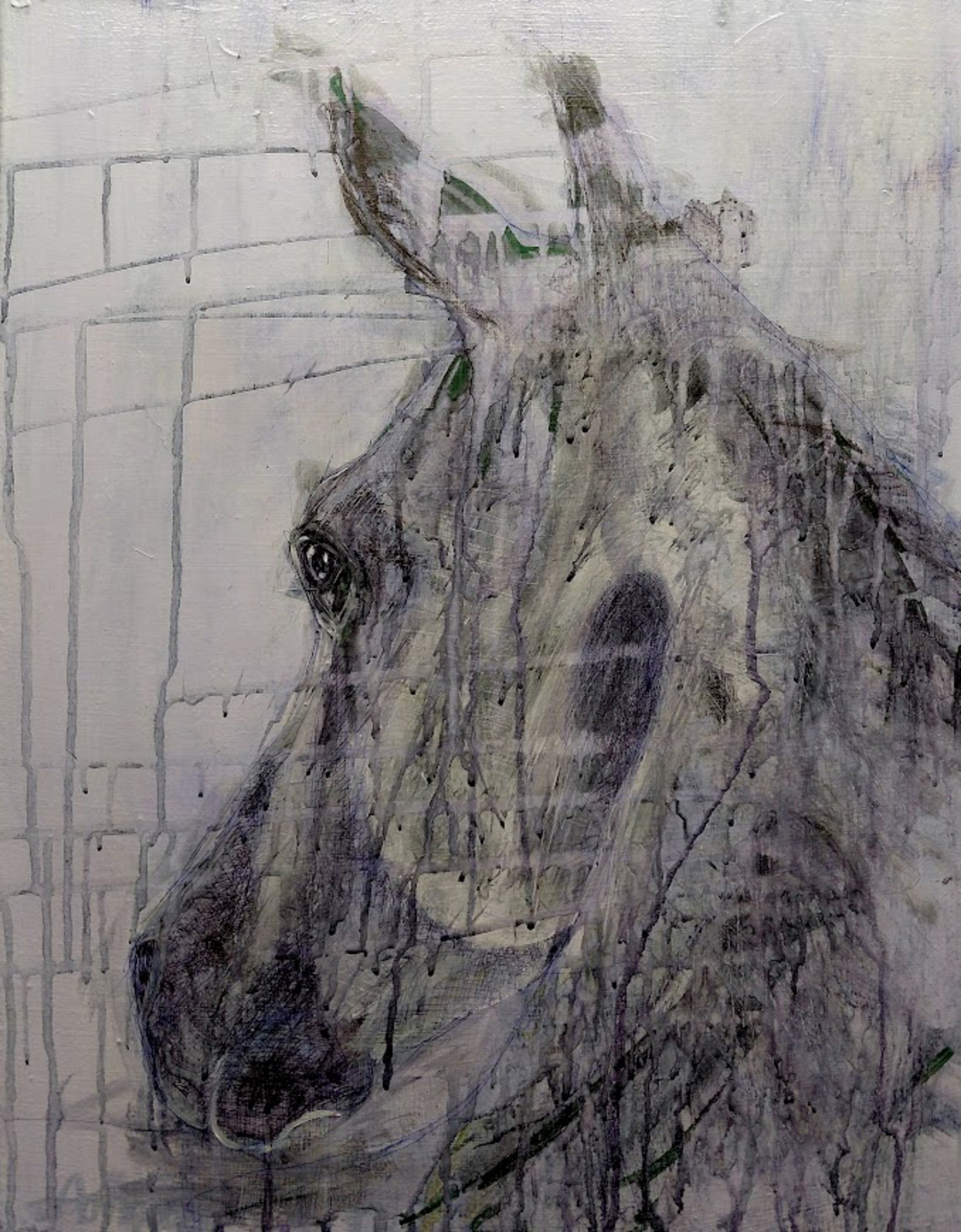 Een paard in profiel, half opgelost in mist en verf. Lijnen druipen, vormen vervagen. Kracht en kwetsbaarheid bestaan tegelijk.