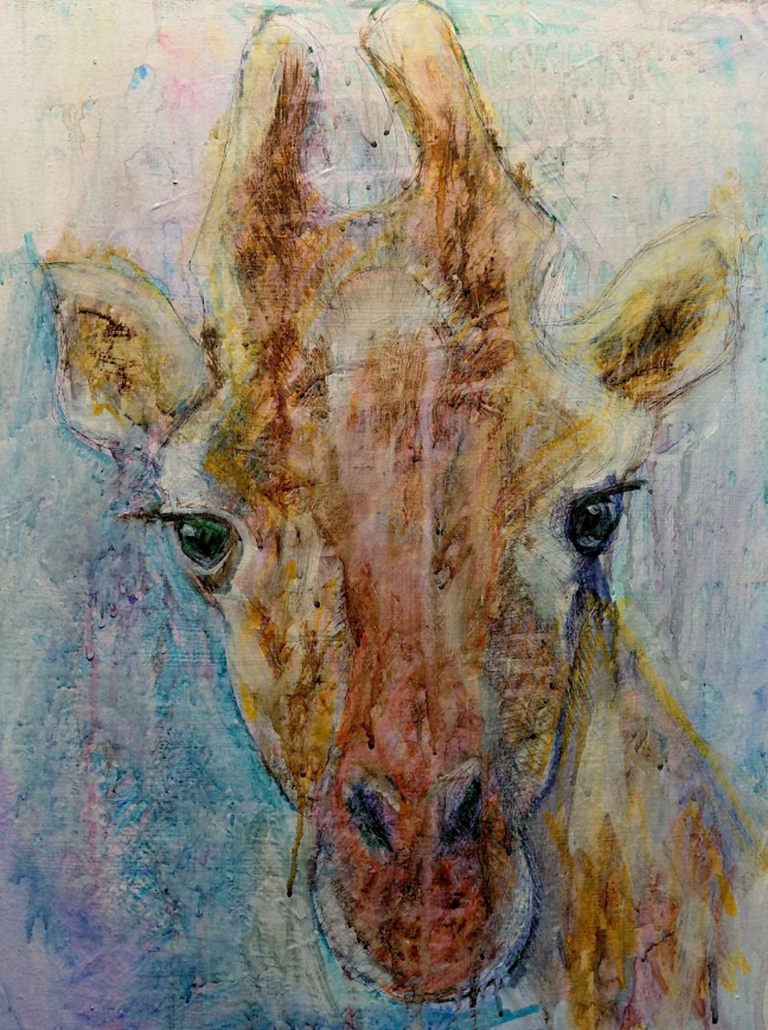Een giraffenkop rijst op uit lagen van kleur en stilte, ogen als zachte vragen in een wereld van verf en adem. De lijnen fluisteren, de tinten druppen tijd, alsof het dier ons ziet—langzaam, mild, en aandachtig.