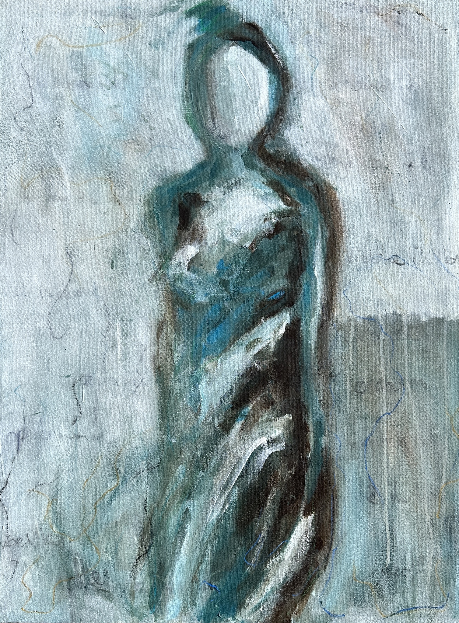 Dit werk is ontstaan vanuit een periode van overgang. Een lichaam dat verandert, een identiteit die verschuift, en de noodzaak om opnieuw te leren kijken naar mezelf. Het is geen poging om vast te houden aan wie ik ooit was, maar om te erkennen wat er is. Ziekte, verlies van controle, het loslaten van een ideaalbeeld en tegelijk het zoeken naar zachtheid en aanvaarding. Dit figuur heeft geen gezicht, omdat het niet alleen over mij gaat. Het lichaam is aanwezig, maar niet vastomlijnd. Het beweegt, vervaagt, draagt sporen. Zoals een lichaam dat geleefd heeft. Onder het werk staat tekst die uitspreekt wat het beeld niet kan zeggen. Samen vormen ze een reflectie op rouw en acceptatie, op het afscheid nemen van een oude vorm en het voorzichtig ruimte maken voor een nieuwe. Dit werk vraagt niet om begrepen te worden, maar om gevoeld te mogen worden. Cette œuvre est née d’une période de transition. Un corps qui se transforme, une identité qui se déplace, et la nécessité de réapprendre à me regarder. Il ne s’agit pas d’une tentative de retenir celle que j’étais autrefois, mais de reconnaître ce qui est. La maladie, la perte de contrôle, l’abandon d’un idéal, et en même temps la recherche de douceur et d’acceptation. La figure n’a pas de visage, car elle ne parle pas uniquement de moi. Le corps est présent, mais non défini. Il se déplace, s’estompe, porte des traces — comme un corps qui a vécu. Sous l’œuvre se trouve un texte qui dit ce que l’image ne peut exprimer. Ensemble, l’image et les mots forment une réflexion sur le deuil et l’acceptation.