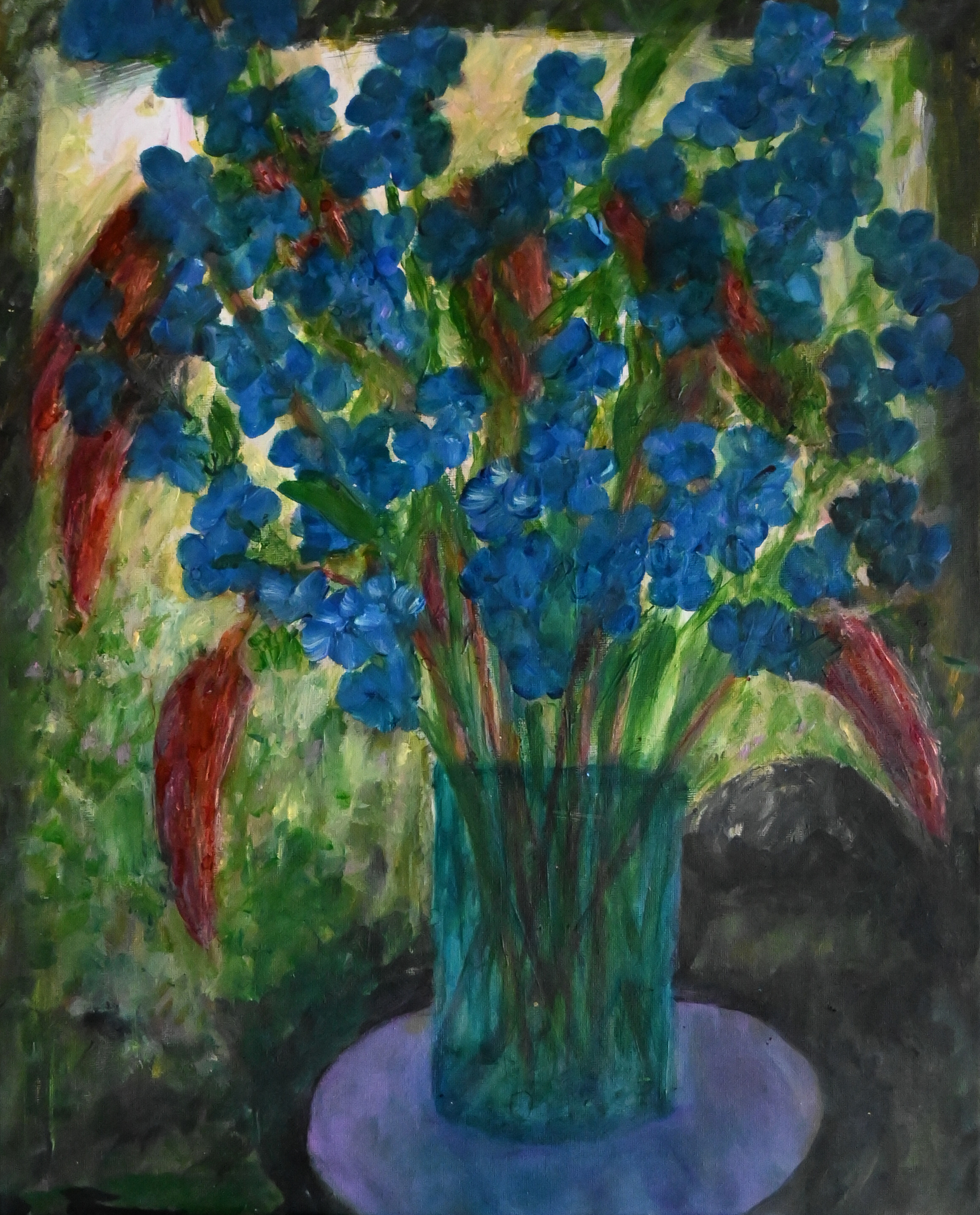Vaas met campanula en rode bladeren