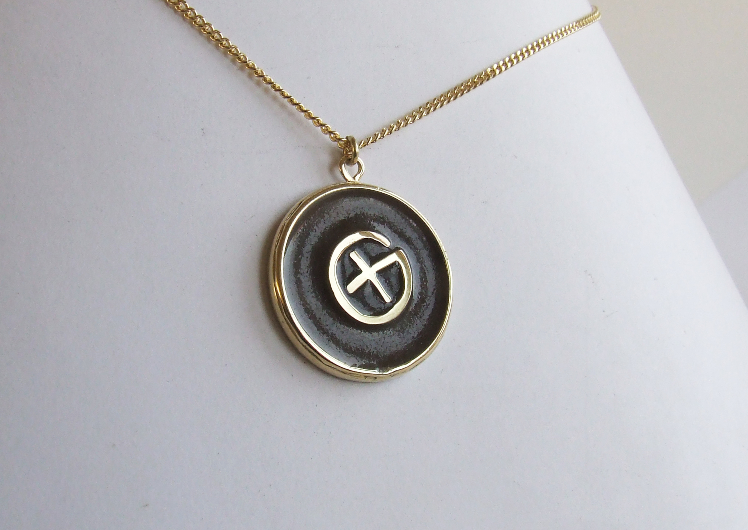 Geelgoud- en zilveren hanger van een trouwring van halve hoogte op een zilveren onderplaat. Hierop is het gouden geocaching symbool aangebracht. Afgegoten met een mengsel van as en heldere giethars. Voorzien van ophangoog en hoogglans gepolijst. (ontwerpopdracht S1221)