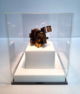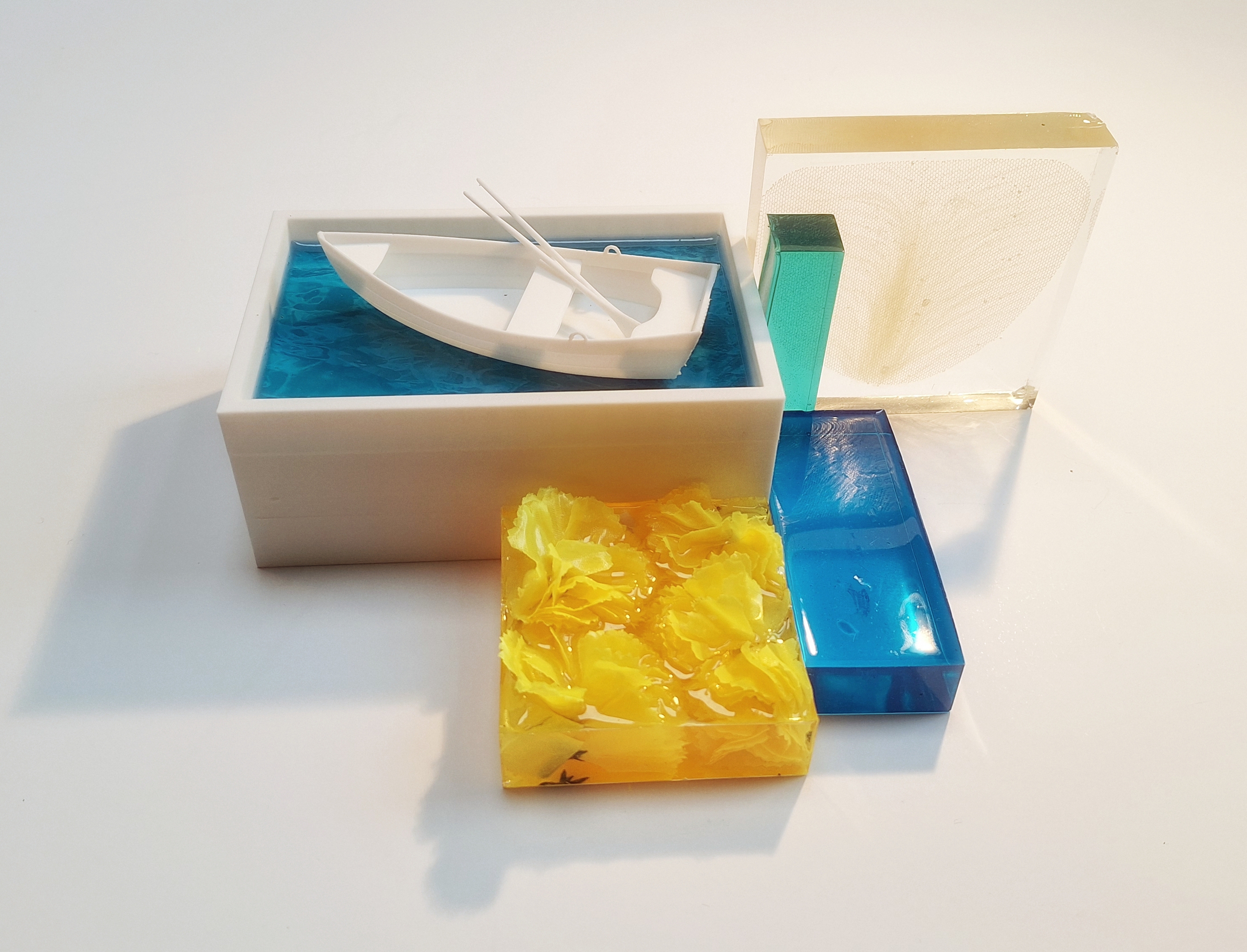 Promesse de bonheur is a sculptural composition consisting of a 3D-printed boat placed on a simulated water surface, resin blocks in blue tones, a resin cast containing artificial pubic hair, and a resin block embedding yellow plastic flowers. The elements are arranged in a balanced, geometric configuration that recalls the visual language of constructivist painting. All materials in the work are artificial, frozen, and inert. Water does not flow, the boat does not move, flowers do not wither, and desire is preserved rather than lived. The composition evokes summer as an image rather than an experience: a season reduced to signs, colors, and surfaces. Despite its formal clarity and apparent lightness, the work carries a subdued melancholy. It does not depict pleasure itself, but the memory of having once expected it. The title, borrowed from Stendhal, points toward happiness as anticipation, as projection into the future. Here, that promise has already passed. What remains is a residue: a still life of expectations absorbed by time. The inclusion of pubic hair introduces a subtle disturbance. Even intimacy is rendered artificial, archived and faintly perverse. The work thus reflects on how desire, memory, and happiness are increasingly experienced as simulations, carefully preserved yet emptied of risk and immediacy.