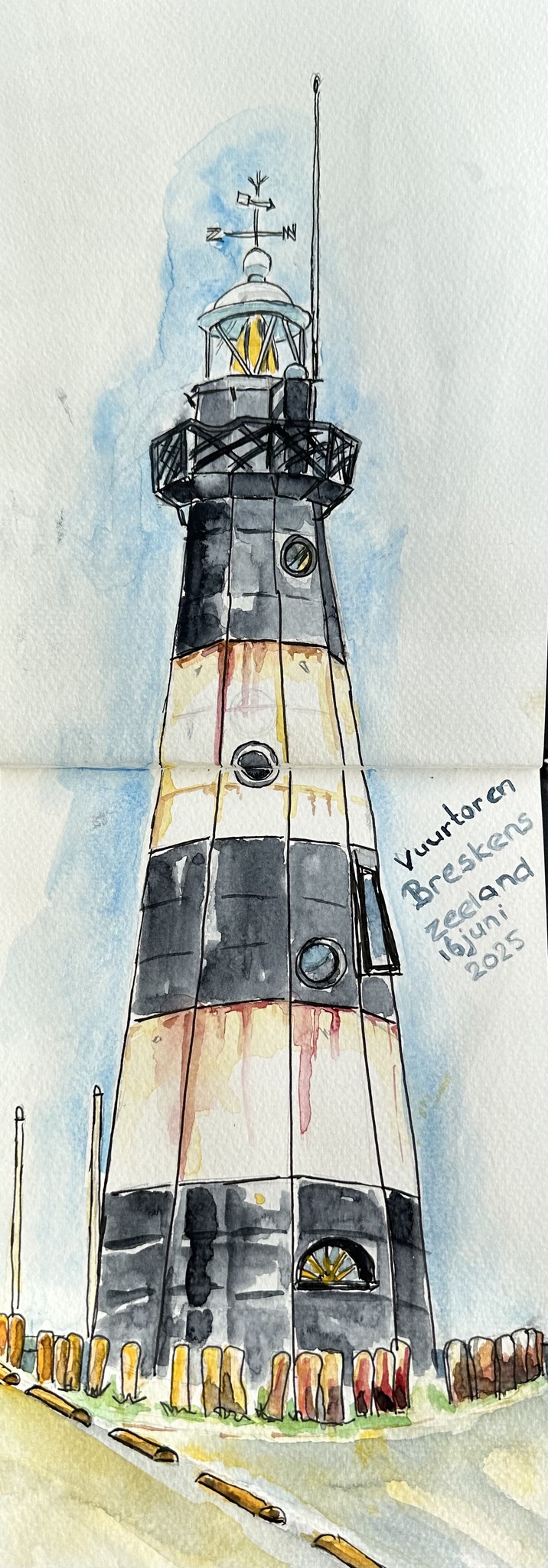 Op vakantie in juni 2025 wilde ik graag een oefening doen met urban sketching. Samen met mijn dochter naar de vuurtoren in Breskens gegaan en deze in de buitenlucht getekend.
