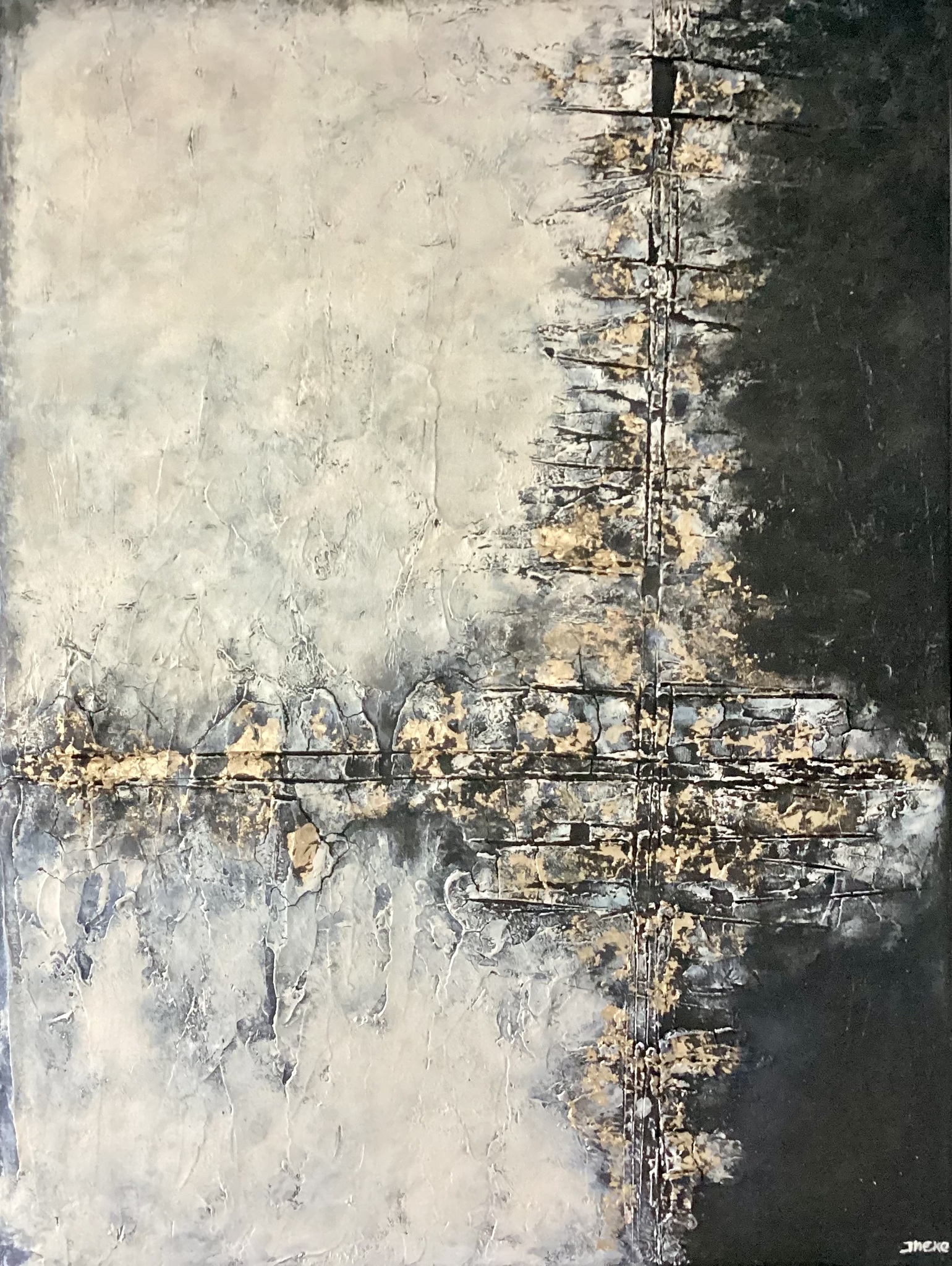 Abstract Grijs Zwart Acryl Goud Doek Op Pasta Ecru Craquelé