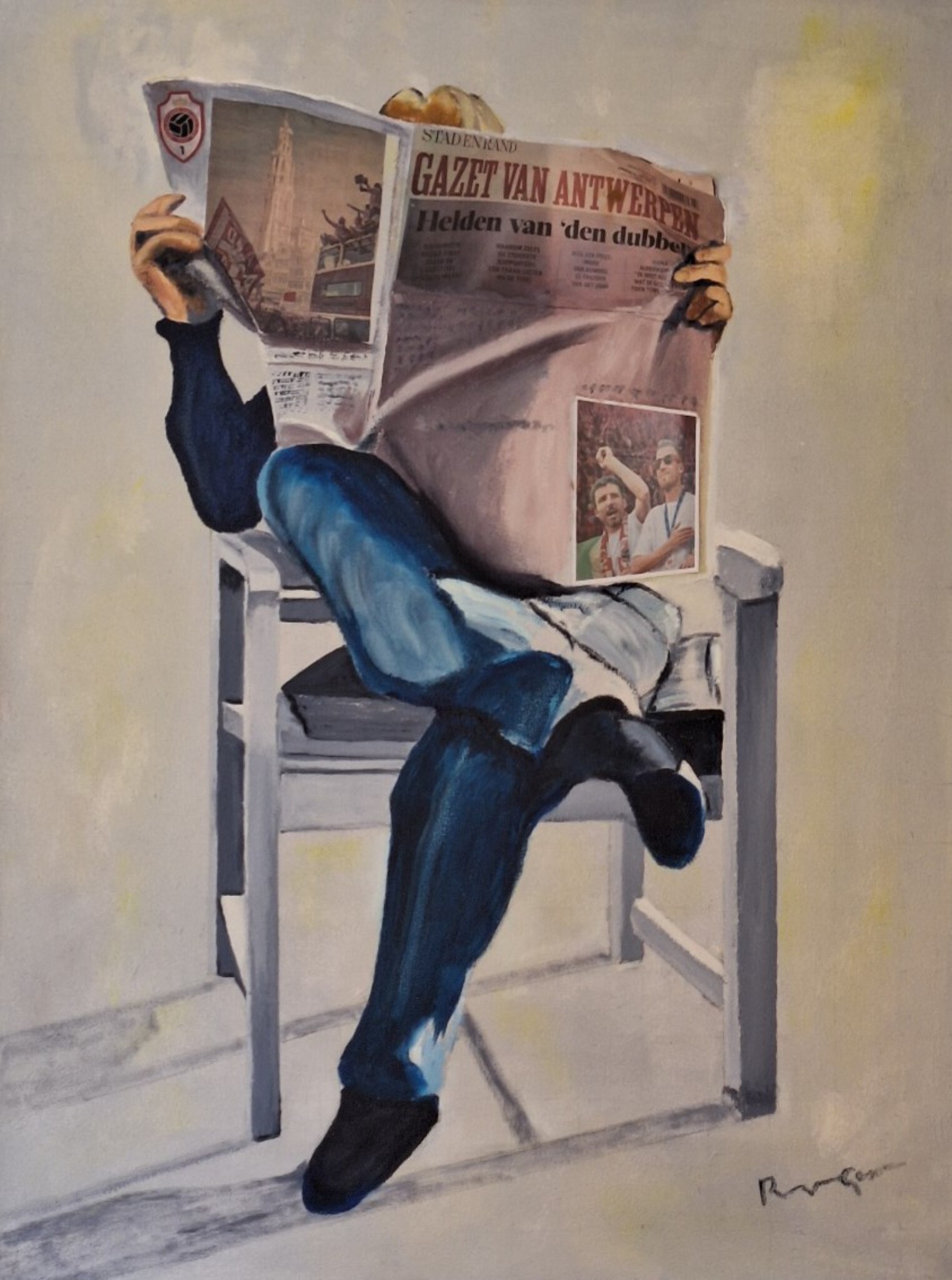 "Den Dubbel" uit de krant Gazet van Antwerpen van 6 juni 2023 geschilderd op de manier van Frans schilder Alain Pontecorvo met gebruik van olieverf en bedrukt papier.