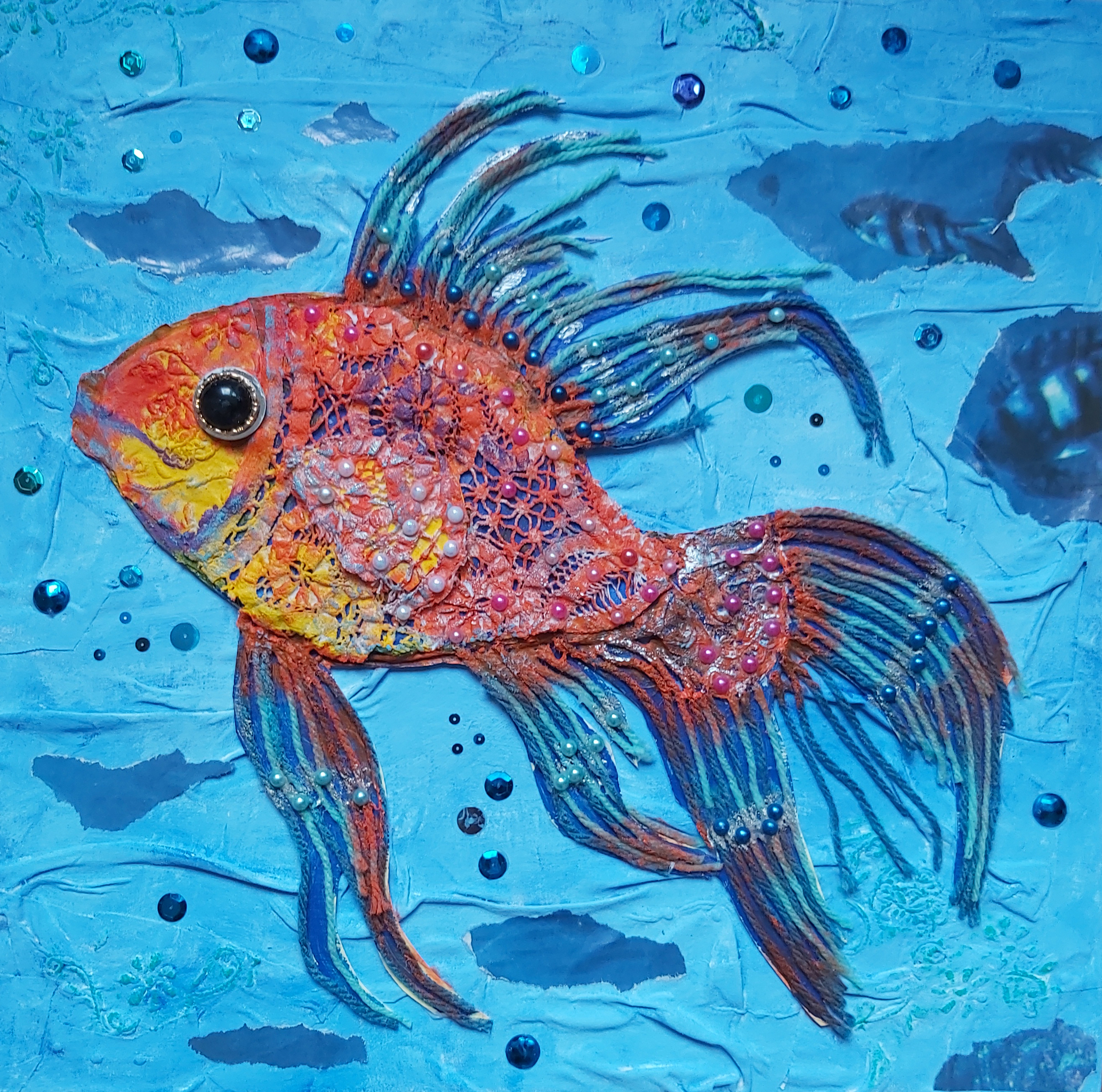 Parel Oceaan Mooie Vis Acryl Collage Stof Kant Pailletten Onder Water