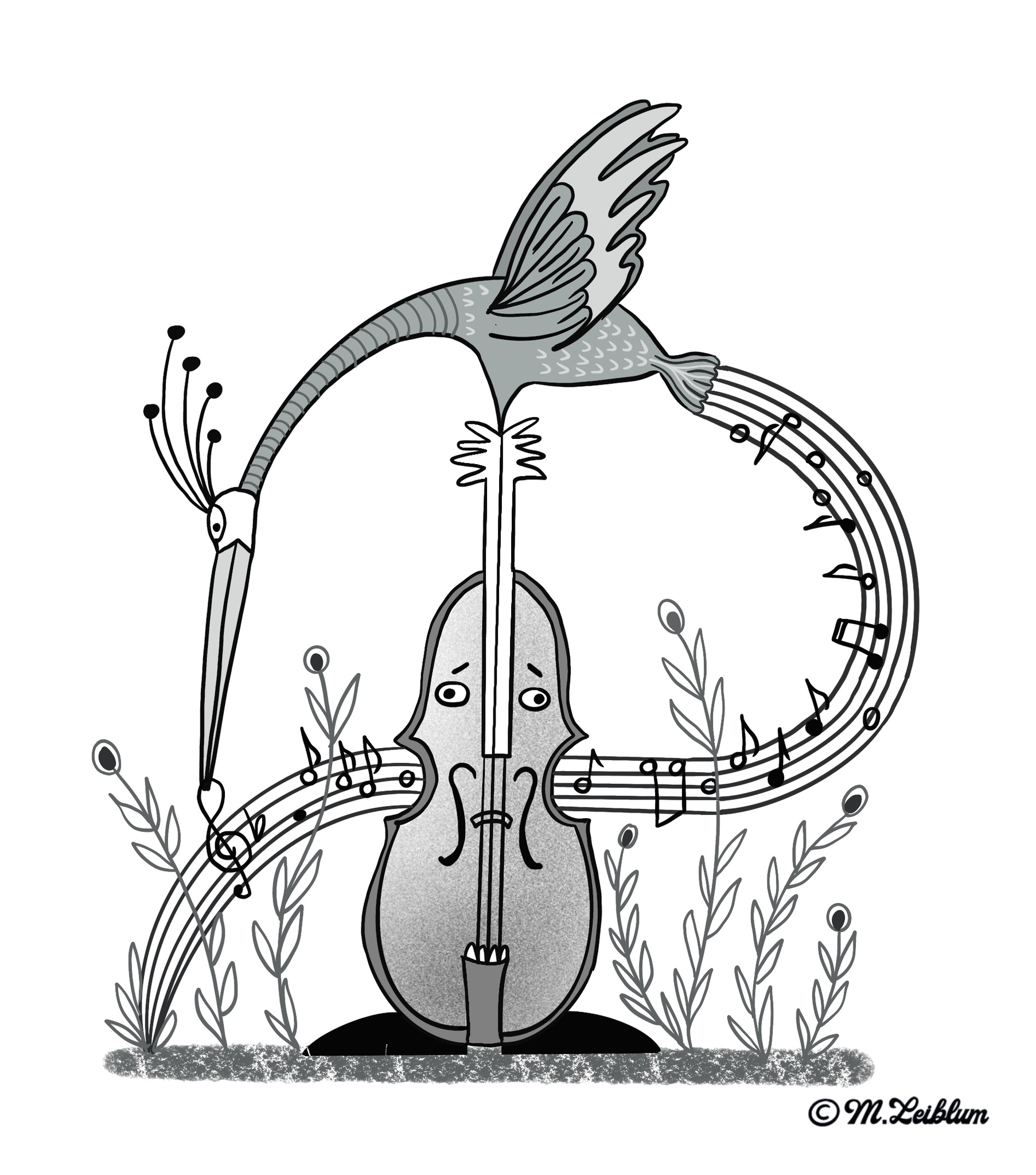 Zwart wit illustratie in kader van inktober, muzikale vogel,