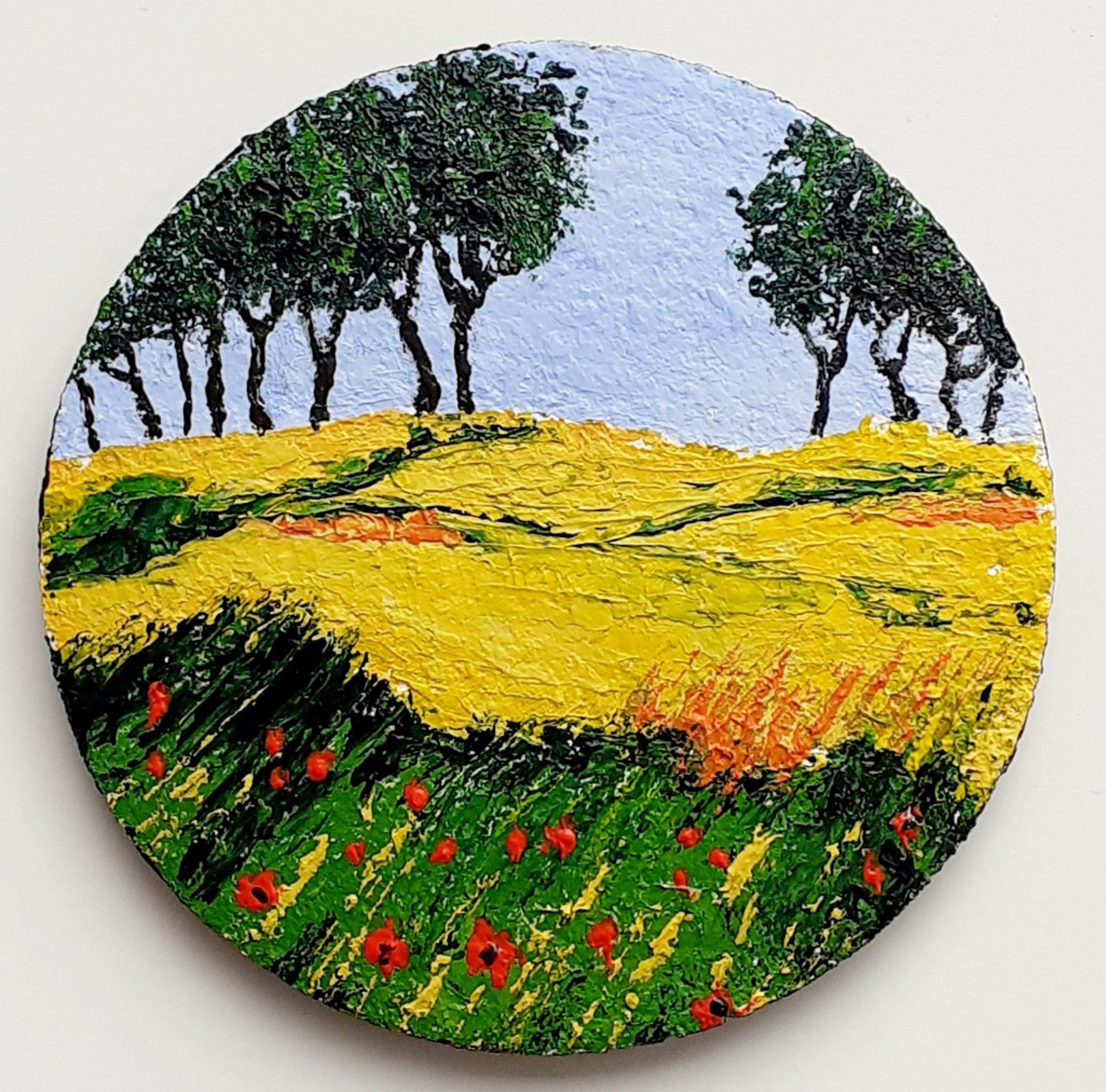 Een onderzetter uit een serie van 6 unieke onderzetters, geschilderd op kurk. Aan beide kanten beschilderd, de andere kant is een abstracte weergave in de kleuren van het landschap.
