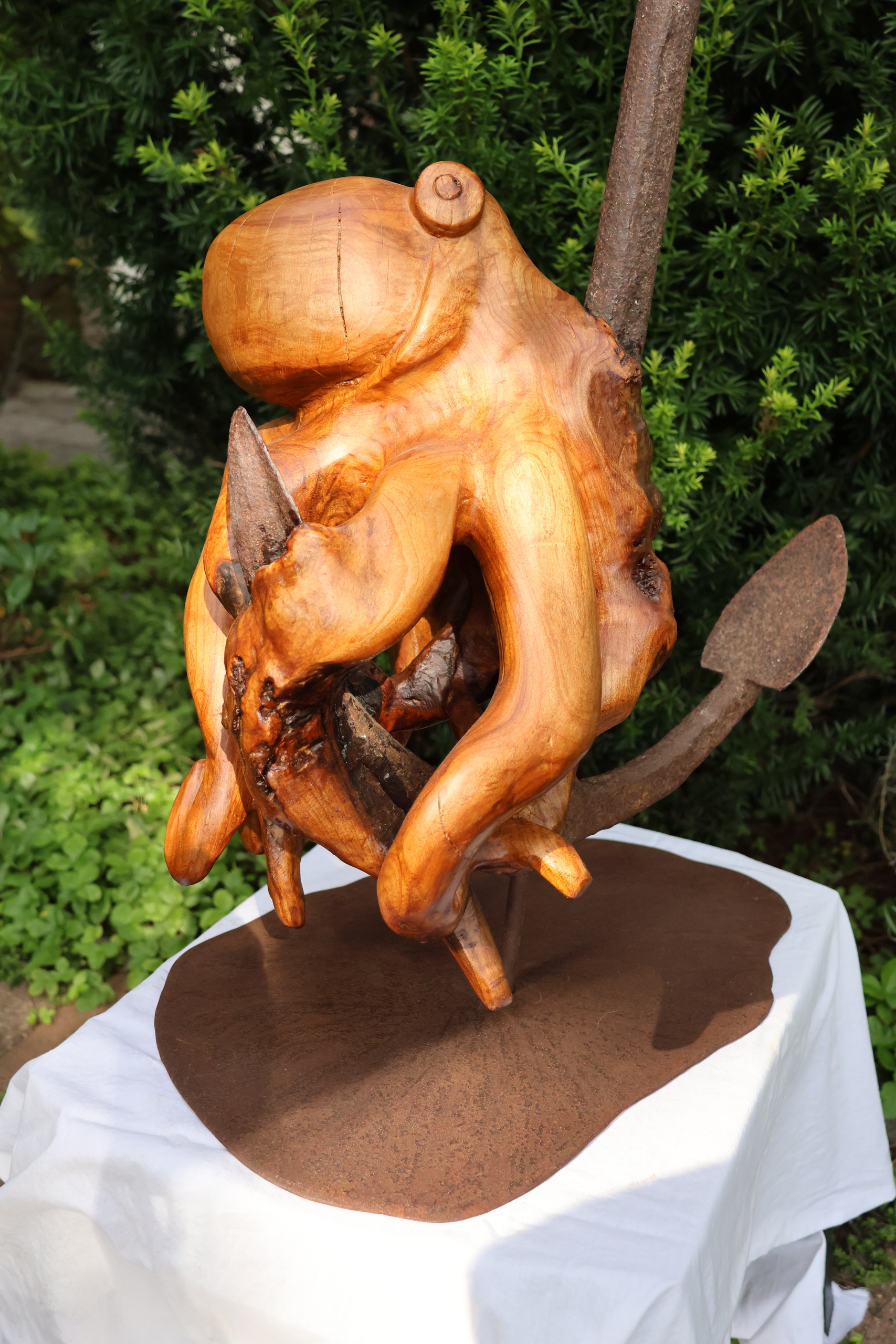 Een anker dat vergroeid was in een prunus. Eens er tegen aan geplaatst. Nu een prachtige octopus. afgewerkt met perkoleum.