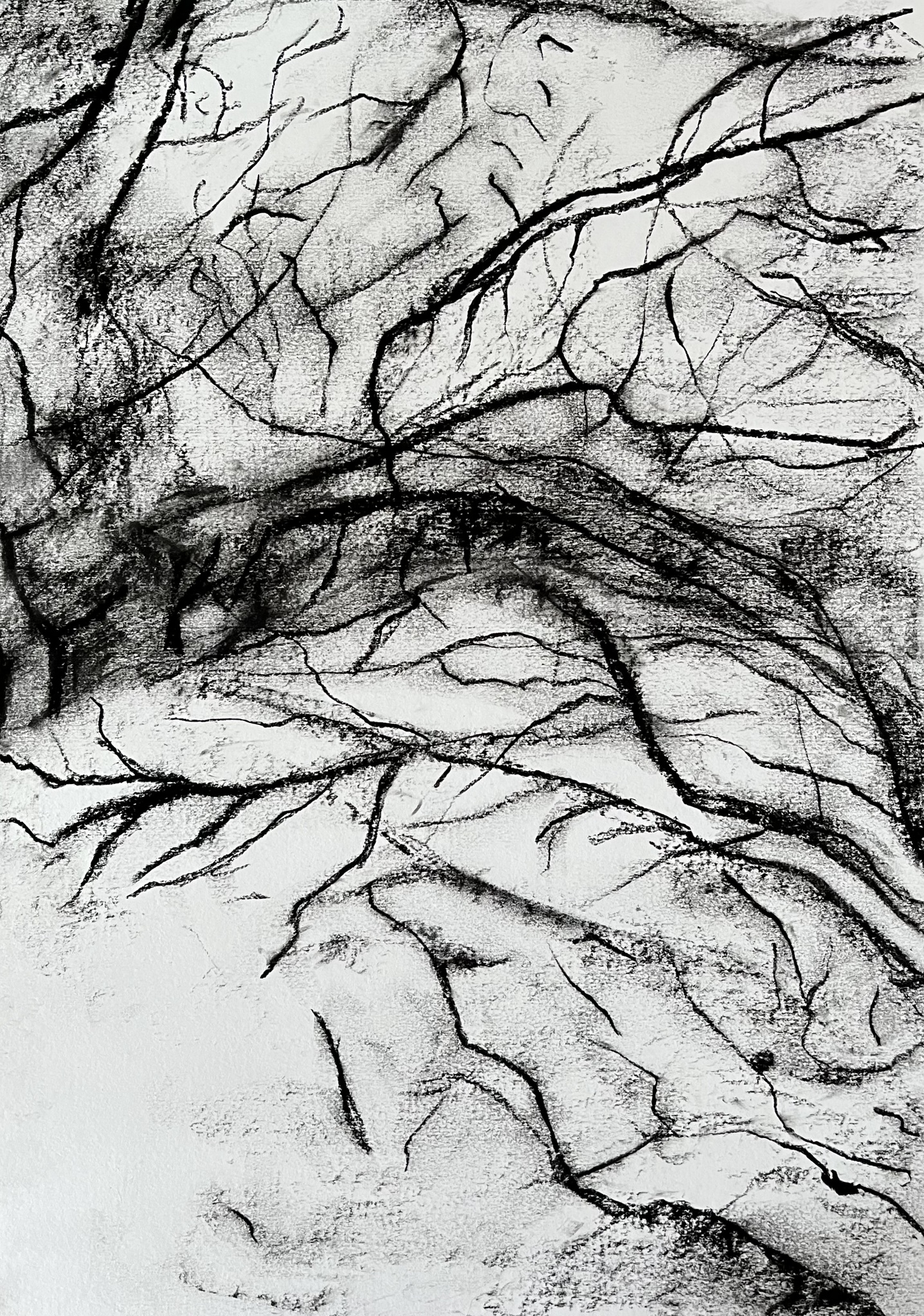 De sneeuw inspireerde om met houtskool deze tekening te maken van een doorkijkje in het park.