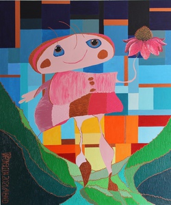 Een collage van behangsnipper en slijpsel van potloden aangebracht met olie omringen een paddenstoel. Werk is 28 bij 28 centimeter. Afmetingen met lijst zijn 41 bij 41 centimeter. A collage of wallpaper shreds and sharpeningdust of pencils, applied with oil, surrounds a mushroom. Work is 28 by 28 centimeters. Whit his frame it's is 41 by 41 centimeters.