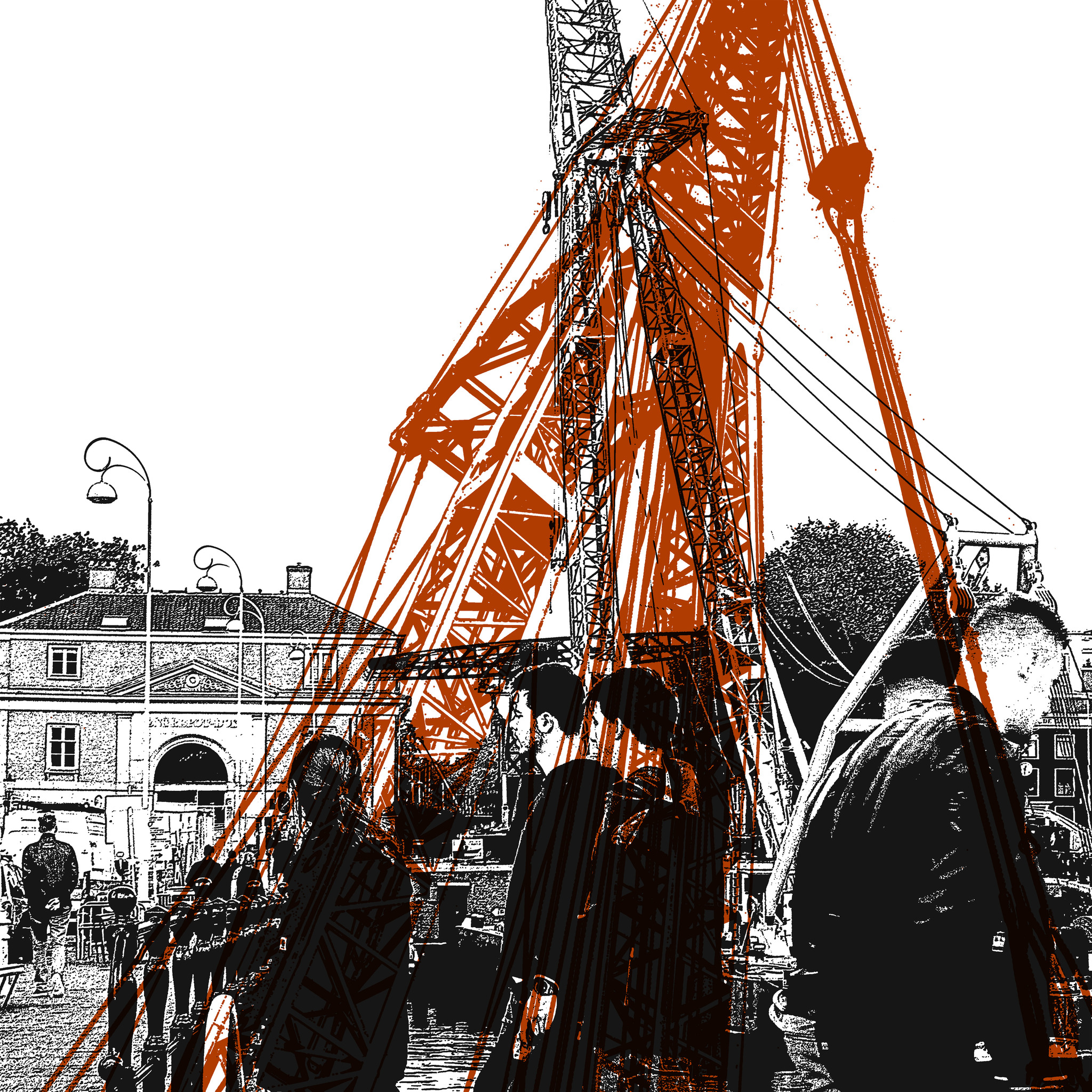 Renovatie Scharrebiersluis 1. - digitale art print Mensen staan te kijken bij de drijvende bouwkranen die de brugdelen van de Scharrebiersluis ophijsen. Locatie: Schippersgracht Amsterdam.