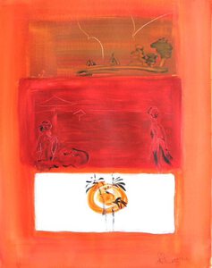 Een oosters lijkend, abstract schilderij in warme tinten, voornamelijk rood, oranje en wit. Het kunstwerk is verdeeld in drie horizontale secties met verschillende scènes of symbolen. Het toont een landschap met bomen en mogelijk tenten, geschilderd met dunne witte lijnen. In het middendeel twee vrouw figuren bij wat lijkt op een strand met parasols, geschilderd in rood. Onderste deel is een cirkelvormige afbeelding ,bamboe en de zon.