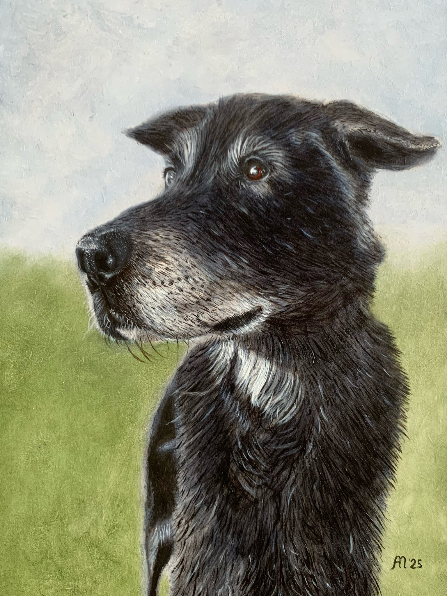 Een krachtig olieverfschilderij van een oudere hond, vastgelegd in een portret dat rust, waardigheid en trouw uitstraalt. De zwarte vacht met zilvergrijze accenten rond snuit, ogen en borst geeft een prachtig gevoel van levenservaring en karakter. De hond kijkt aandachtig in de verte, met een zachte maar scherpe blik die zowel alertheid als sereniteit uitdrukt. Het subtiele spel van licht op de vacht en de realistische details in de ogen zorgen voor een levensechte en ontroerende weergave. De achtergrond is eenvoudig gehouden in zachte groentinten en een luchtige hemel, waardoor alle aandacht naar de hond gaat. Dit schilderij is een ode aan de band tussen mens en dier, en legt de essentie van trouw en wijsheid in één beeld vast.