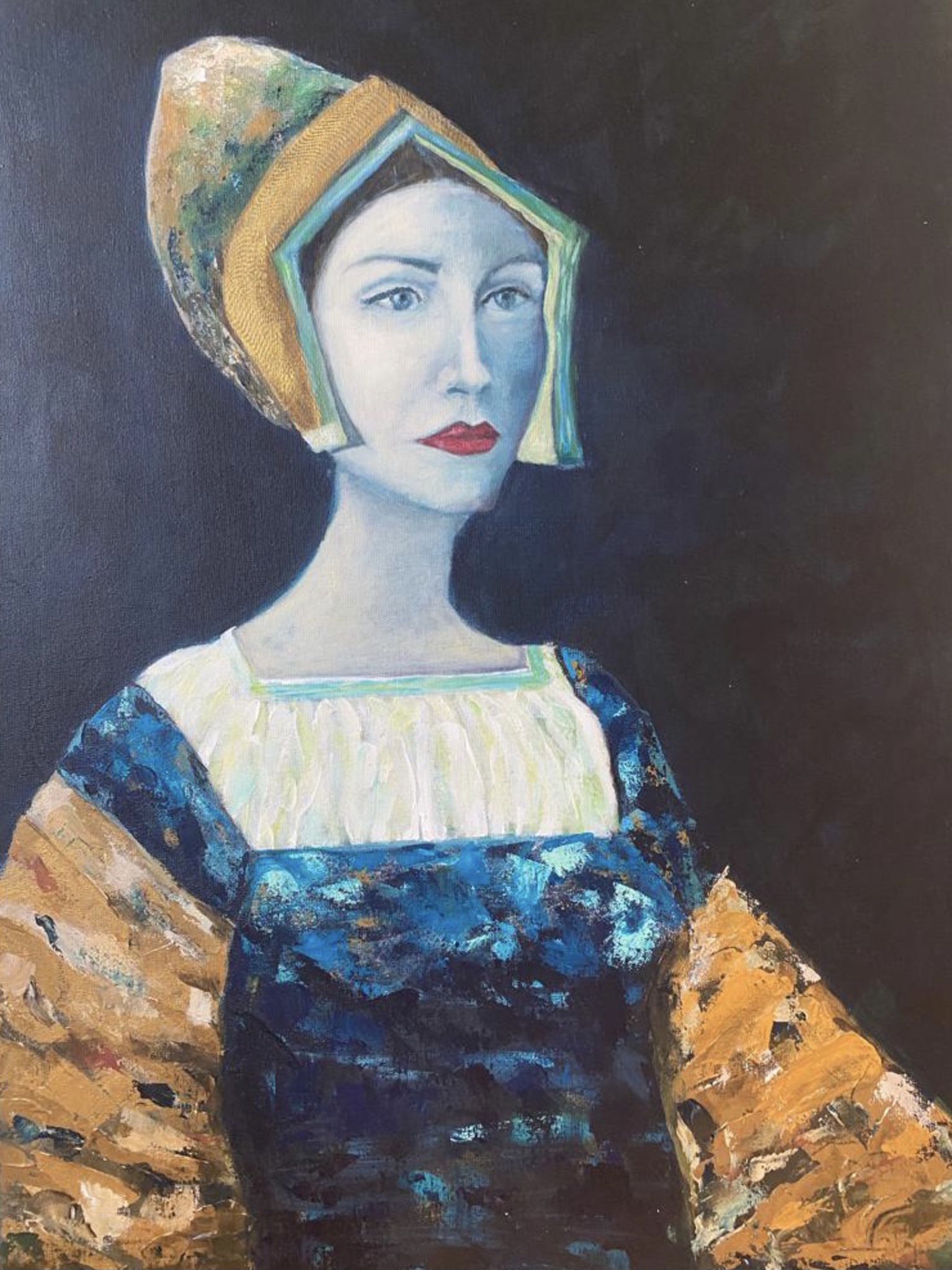 Een realistische, middeleeuwse dame van adel in klederdracht met een moderne touch, waarbij de kleding met een paletmes is aangebracht.
