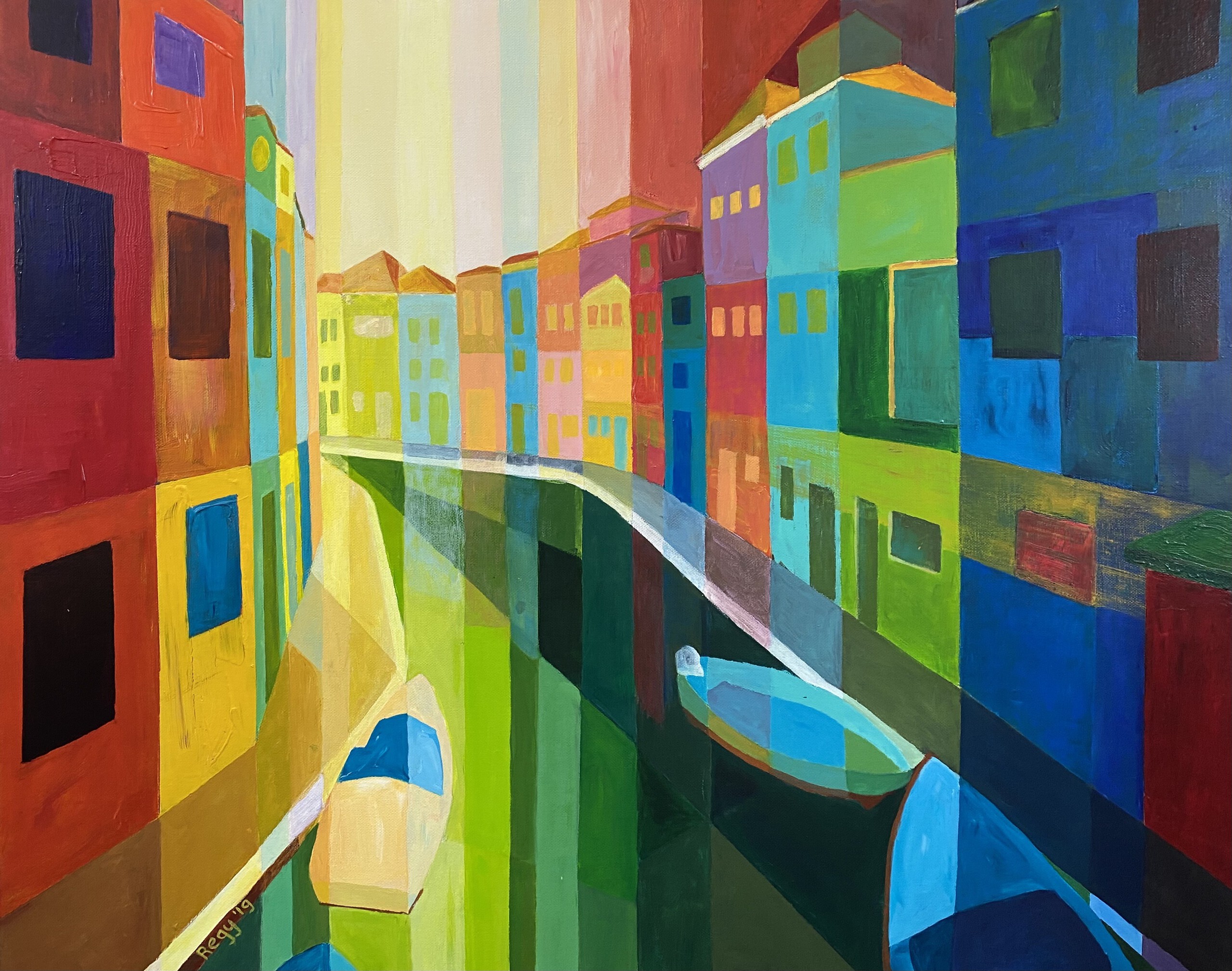 Een kleurrijke weergave van een Venetiaanse wijk op linnen doek