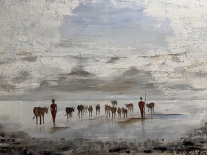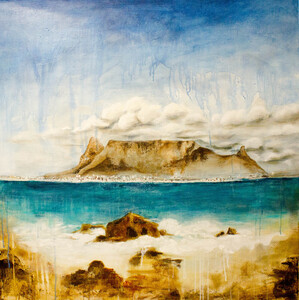 Doek is geïnspireerd door mijn reis naar Kaapstad, Zuid-Afrika 2024. Uitzicht is de Tafelberg in Kaapstad gezien vanaf Robbeneiland. Robbeneiland bij Kaapstad is een historische gevangenis, bekend van Nelson Mandela, nu een UNESCO-werelderfgoed en museum dat je bezoekt met een rondleiding per veerboot vanaf de V&A Waterfront, begeleid door (vaak voormalige) gevangenen die de indrukwekkende geschiedenis van apartheid vertellen en cellen laten zien.