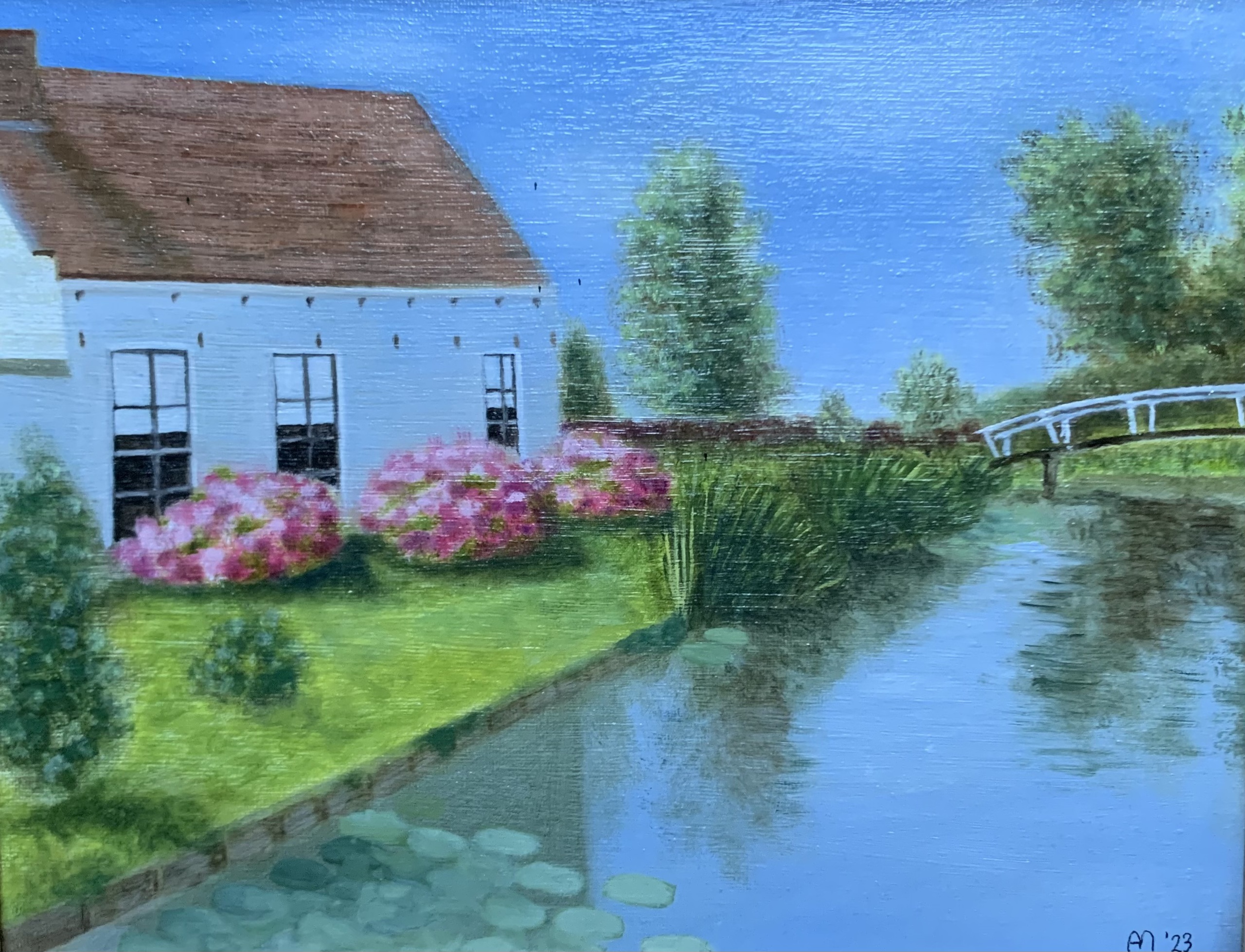 Dit olieverfschilderij toont een idyllisch Zuid-Hollands landschap in zomerse sferen. Op de voorgrond weerspiegelt het rustige water van een smalle sloot de blauwe lucht en het omliggende groen. Een wit huis met een rood pannendak staat vredig aan de waterkant, omringd door weelderige hortensia’s in volle bloei. Rechts leidt een charmant wit bruggetje over het water naar een met bomen omzoomd pad. De zachte kleuren en het serene karakter van het tafereel roepen een gevoel van rust, nostalgie en landelijke eenvoud op.