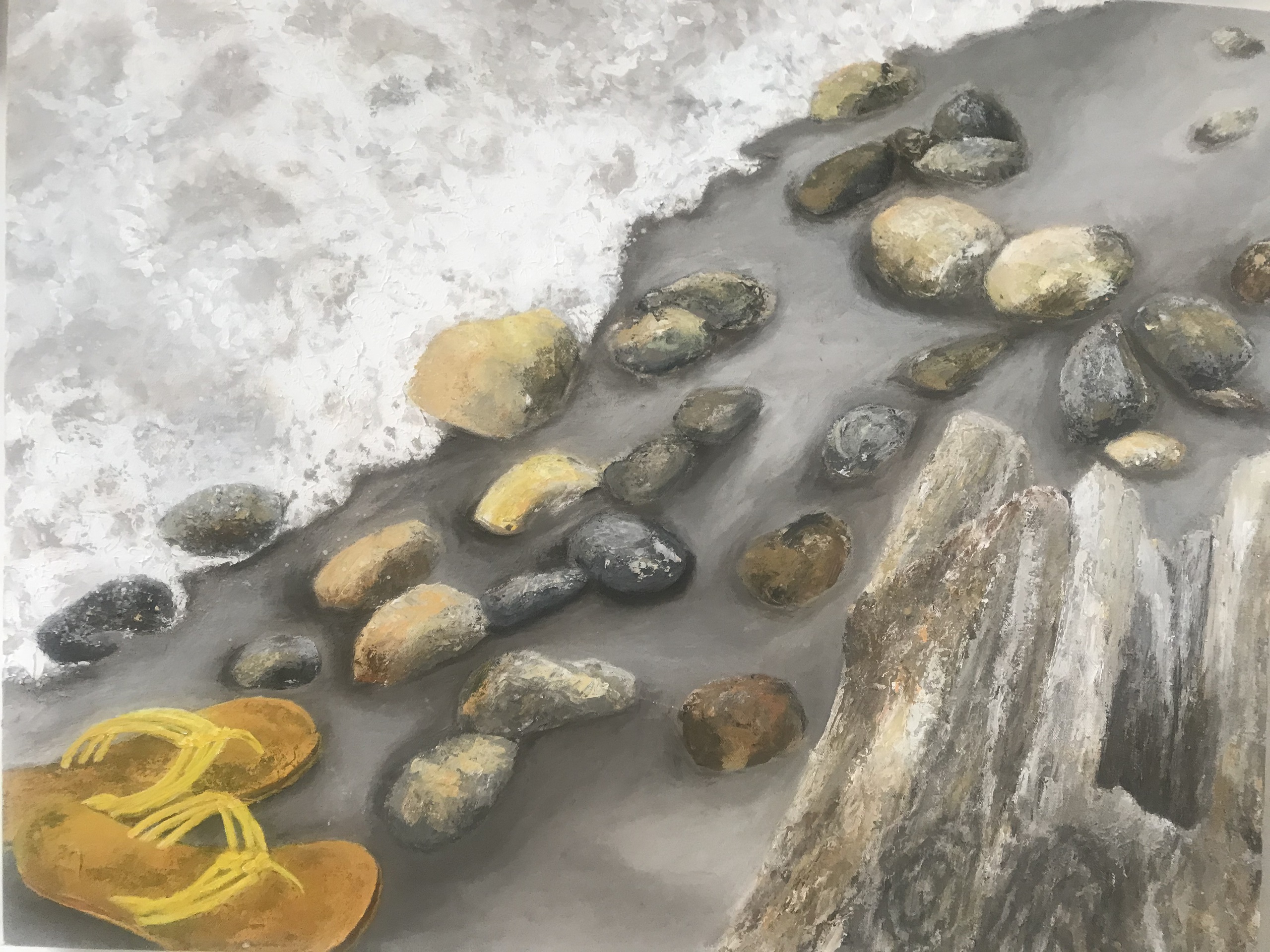 impressie van wrakhout, stenen en badslippers op het strand in Sicilie