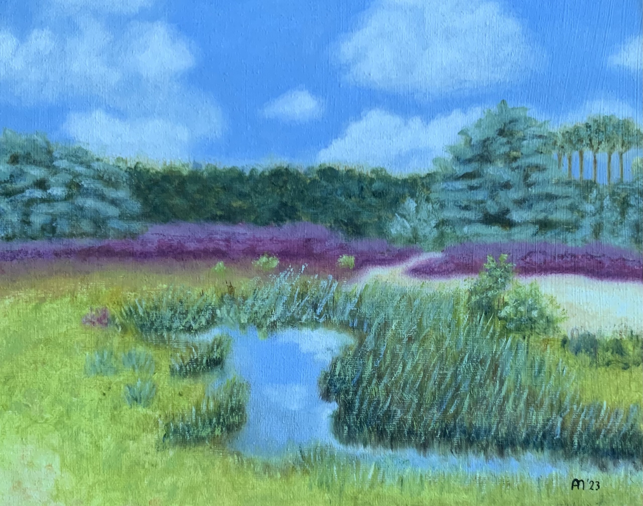 Olieverfschilderij op canvasboard met lijst (29,5 x 35,5 cm). Dit sfeervolle landschap toont een zomerse heide in volle bloei, waar paarse heidestruiken afsteken tegen het frisgroene gras en een heldere lucht. Een kabbelend beekje leidt de blik naar de bosrand in de verte. Dit werk vangt de rust en schoonheid van de natuur in een warm seizoen.