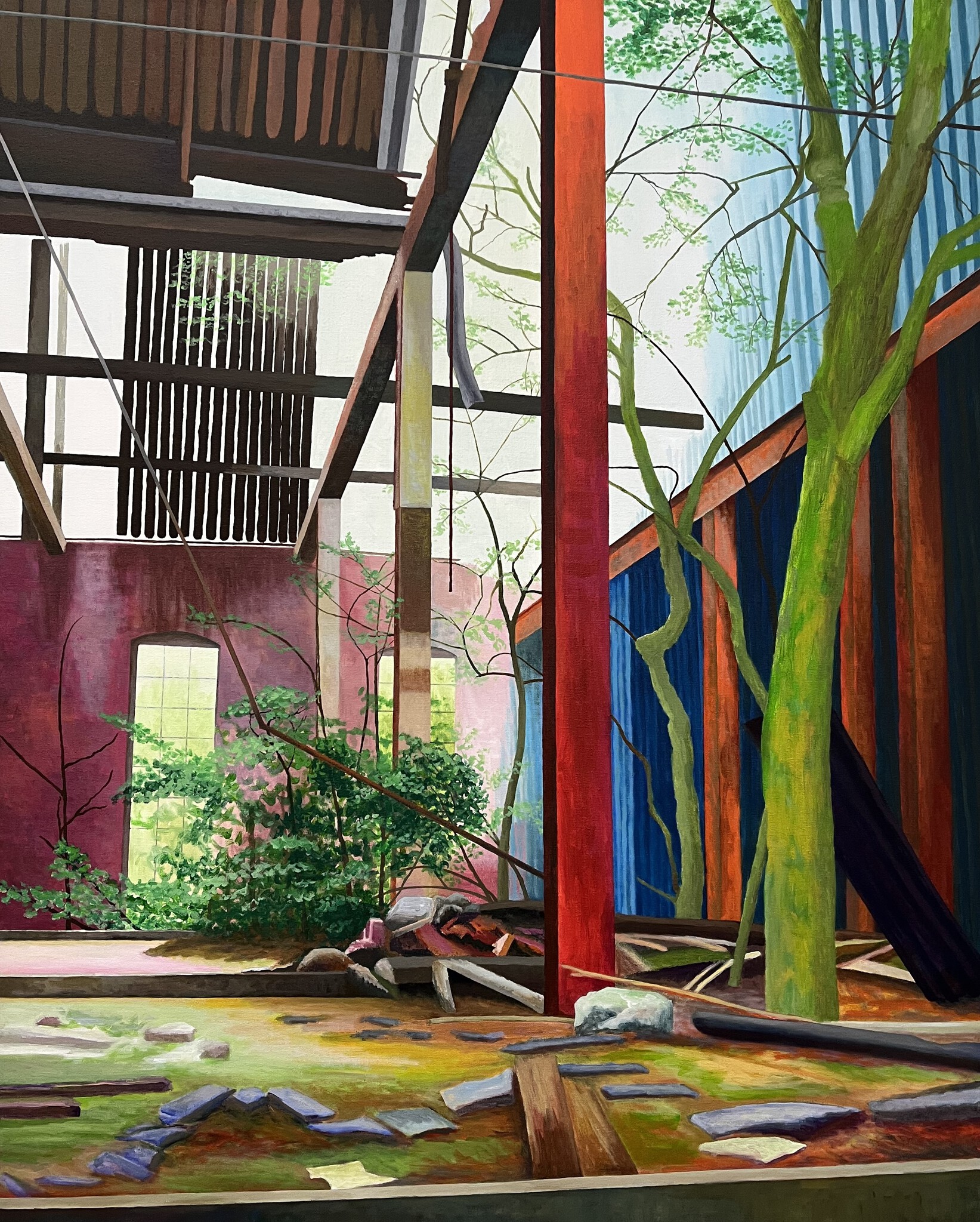 Maaike Nijlunsing schildert veelal gebouwen, waar het verval haar intrede heeft gedaan. Ze heeft een grote voorliefde voor industrieel erfgoed en slooppanden. Oude fabrieken, maar ook leegstaande flatgebouwen of woonwijken in afwachting van afbraak. In de schilderijen staat gelaagdheid centraal, in samenhang met het zoeken naar de suggestie van diepte in het platte vlak van het canvas. Maaike studeerde in het jaar 2000 af aan de Academie Minerva in Groningen. Daarna specialiseerde zij zich in het schilderen aan de DAI in Enschede en studeerde filosofie aan de Rijksuniversiteit Groningen. Maaike woont en werkt in het Groningse Noordbroek.