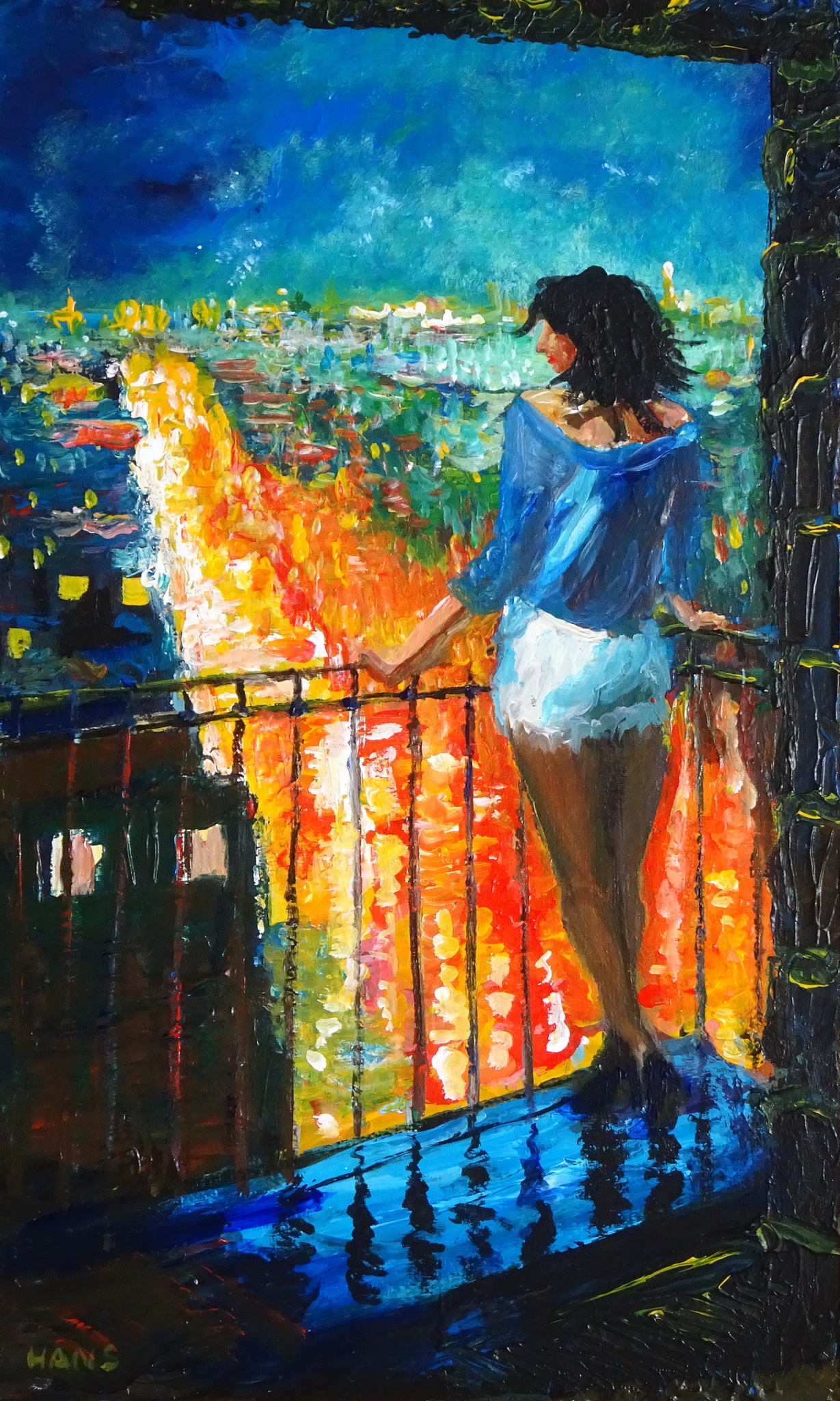 Een meisje kijkt 's avonds uit over een drukke Parijse boulevard in regenachtig weer