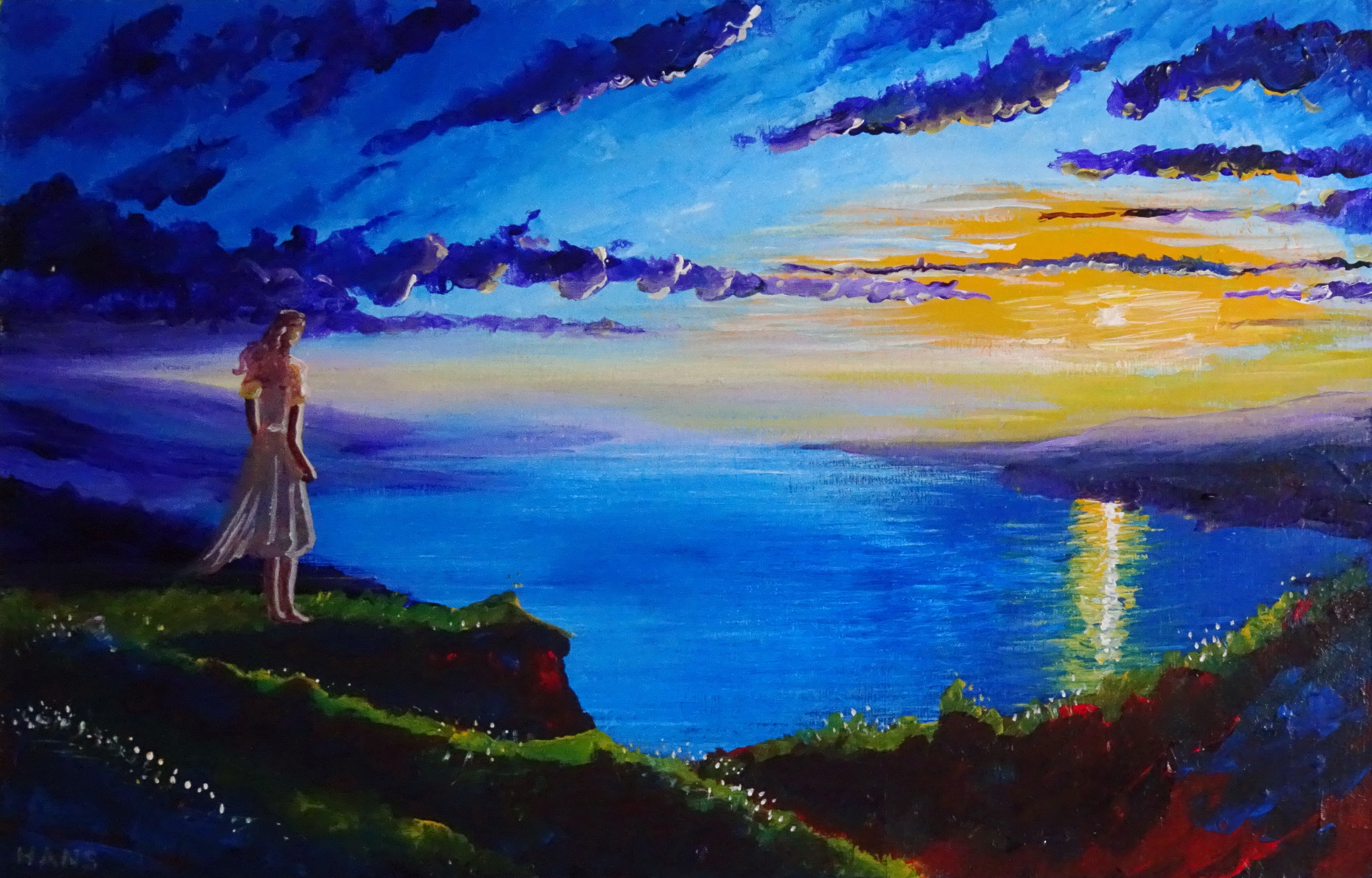 Een dame kijkt vanaf een uitzichtpunt naar de ondergaande zon