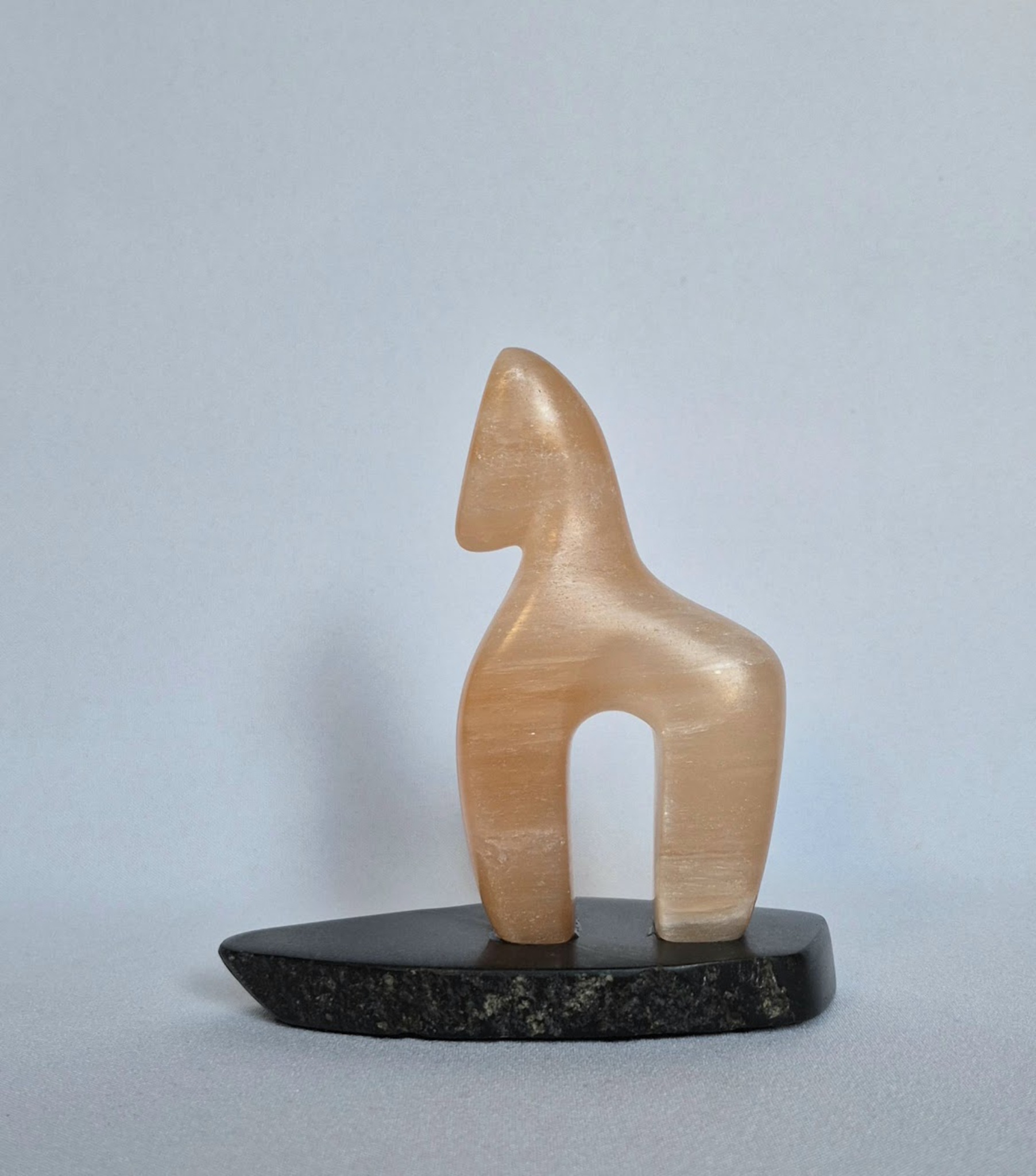 Aiyanar paard, oranje albast op sokkeltje van springstone. Jan. 2026