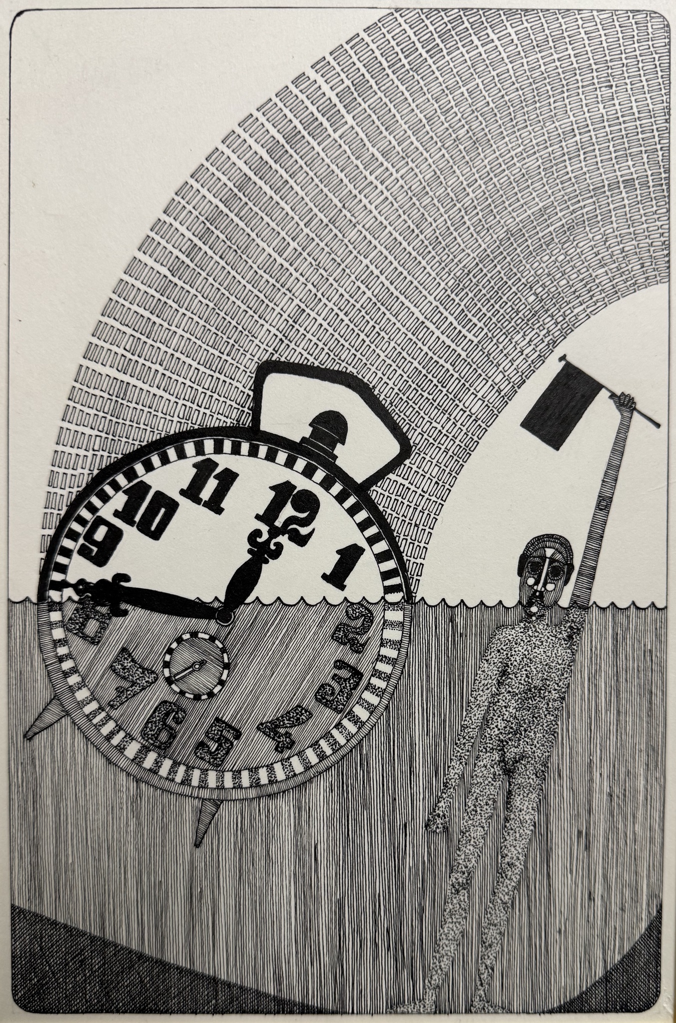 Tekening gemaakt met kroontjespen, gepunt stokje, penseel en Oost-Indische inkt. Gerealiseerd op ivoorkarton.