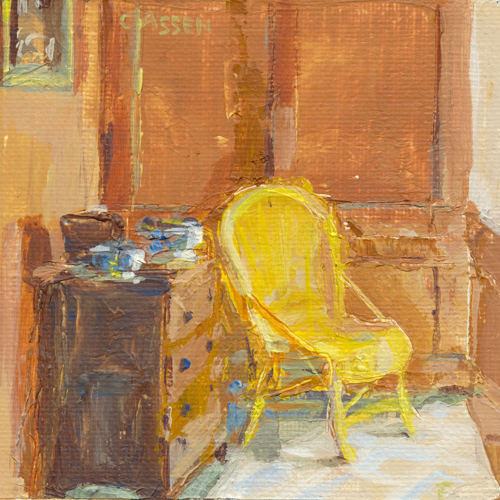 afm.: 10 x 10 cm geel rieten stoeltje