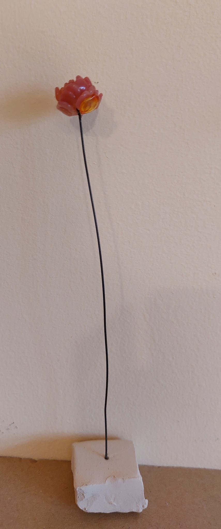 oud roze dahliaatje van glas met metalen staafje in keramisch voetje