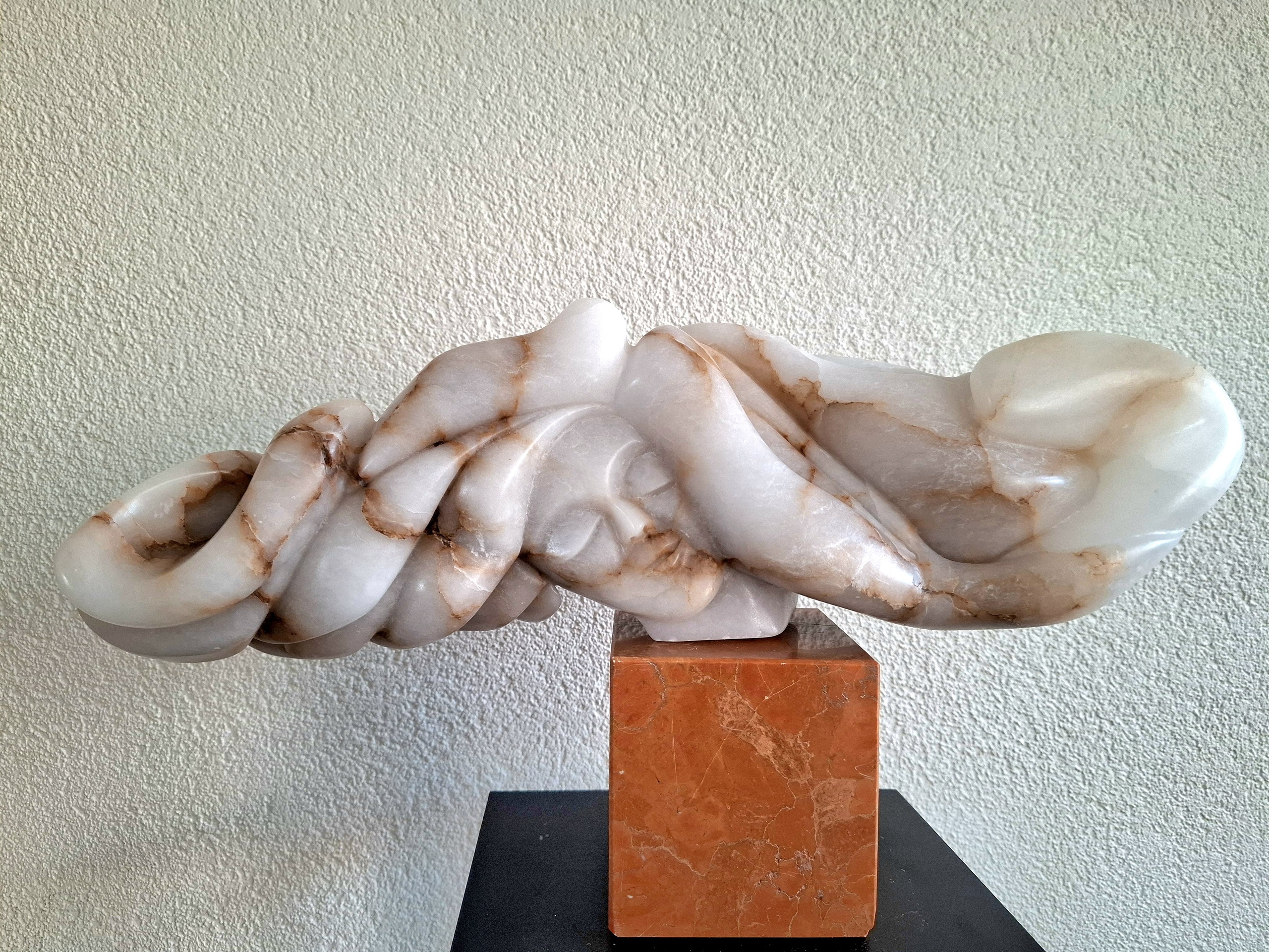 Een beeld gemaakt uit witte albast met bruine aders. De haren drijven op de golven van het water. De sokkel is van marmer.