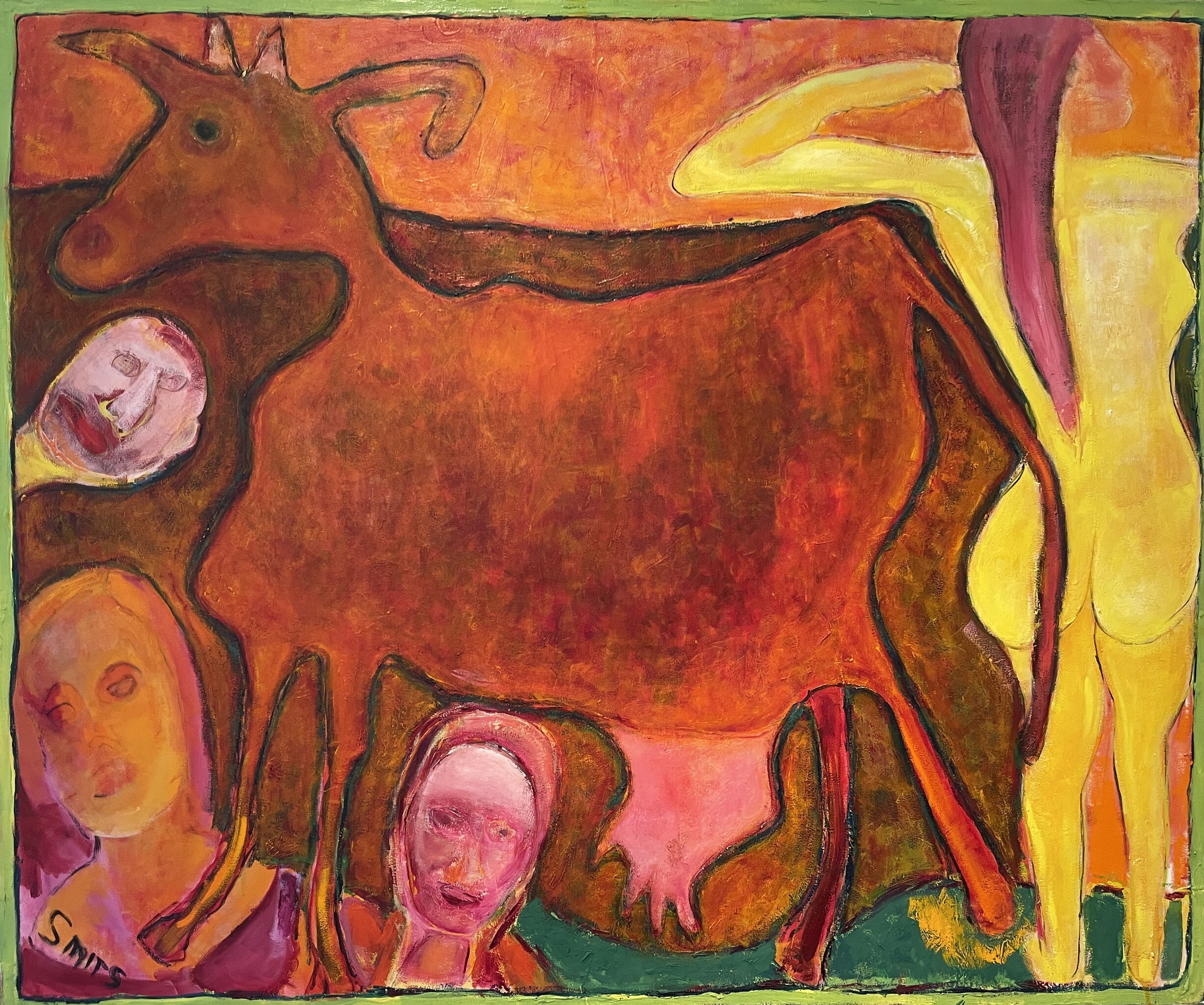 Ooit begonnen met het schilderen van Hollandse landschapjes en plein air schilder ik nu graag dieren en mensen. Na het schilderen van deze roodachtige geit was er voldoende ruimte over om een staande vrouw en een drietal gezichten te plaatsen. Zowel de geit als ook de vrouw en de gezichten heb ik zonder voorbeeld op intuitie geschilderd.