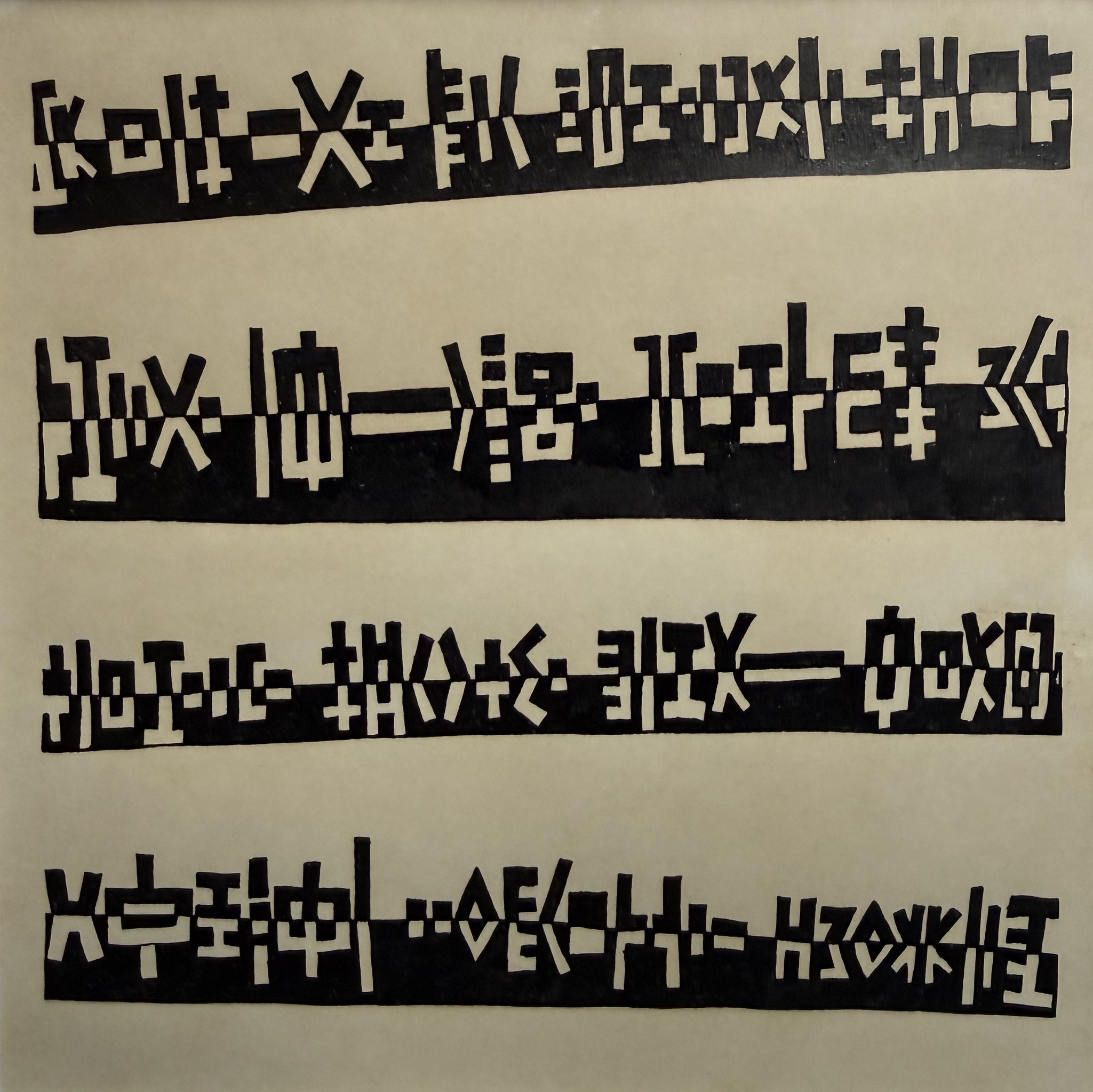 Pentekening. Kroontjespen, penseel, Oost-Indische inkt, ivoorkarton. Vier regels met tekens in zwart-wit. Ontwerp voor tijdschrift Trotwaer 1977-1.
