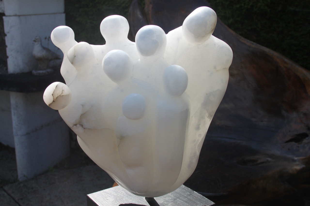 beeld van albast op sokkel van hout. Het verbeeldt een groep mensen, verbondenheid. Albast is geschikt voor binnen.