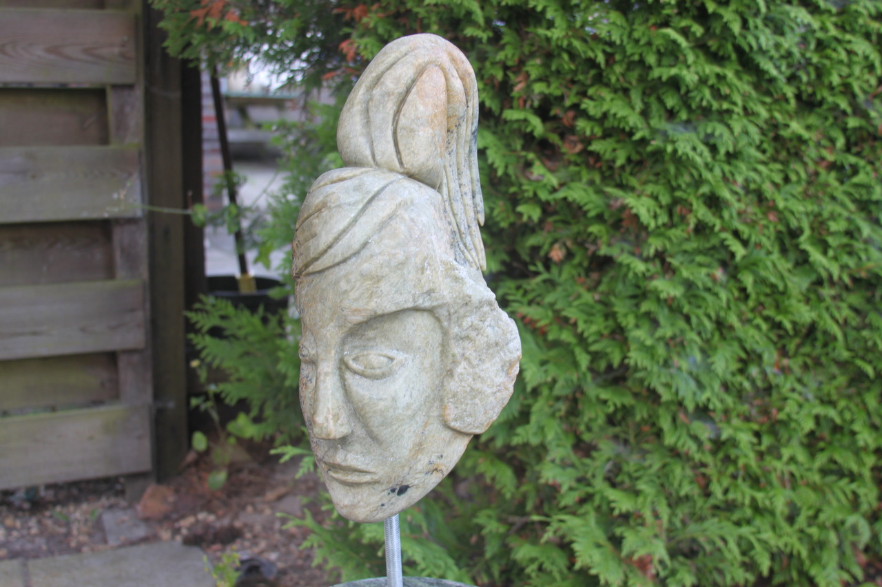 beeld van speksteen. Het gezicht wordt door de structuur van de steen op een verrassende manier gevormd.