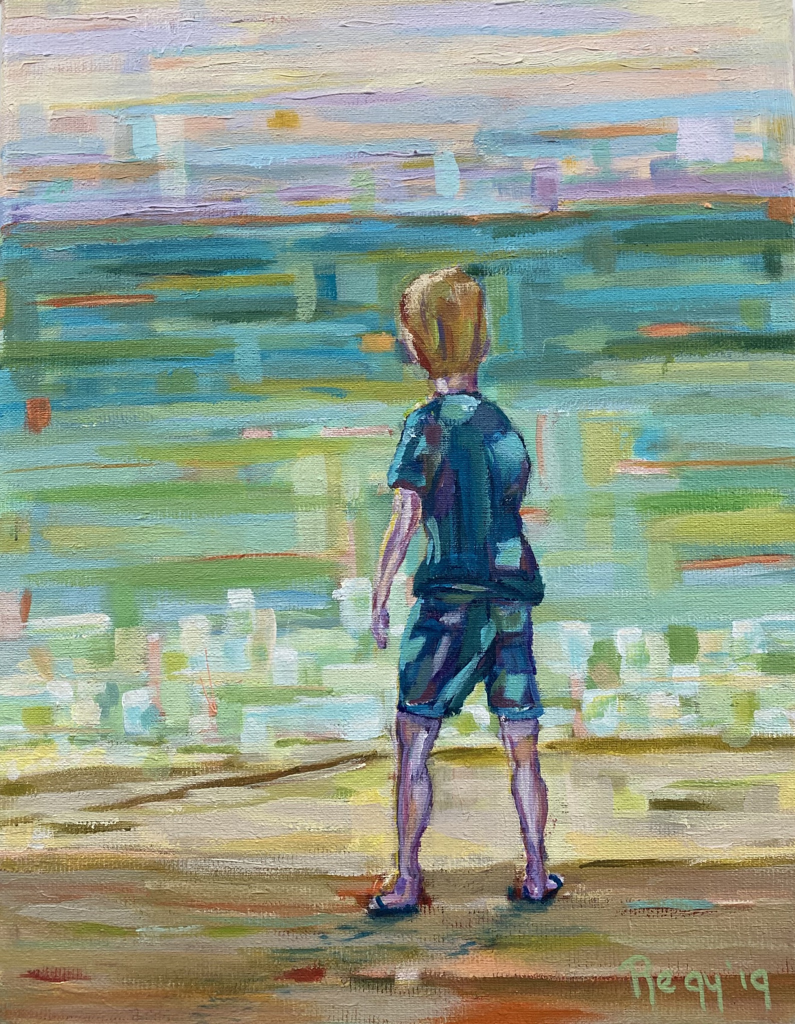 Lieflijk tafereeltje van een jongetje aan zee. Met losse toetsen geschilderd in pasteltinten.